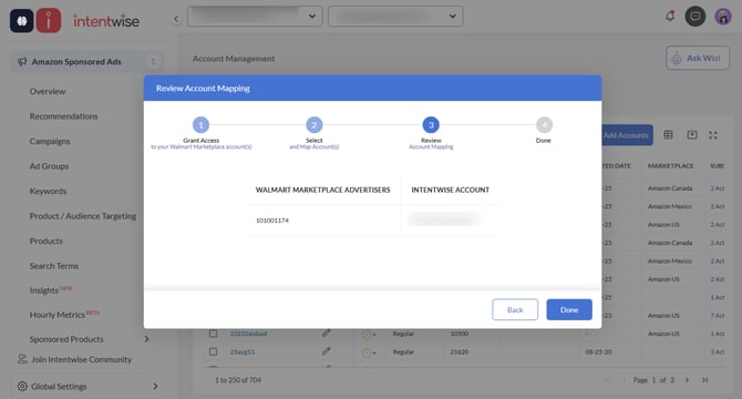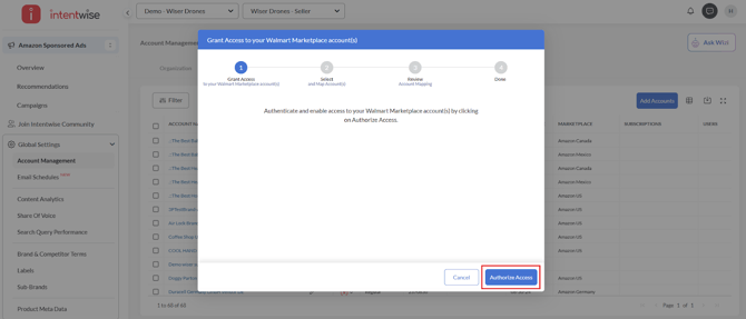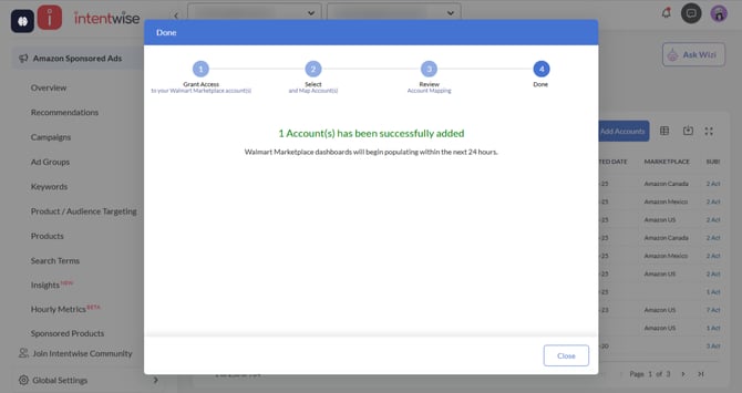 - Click on Next to initiate the setup. The data in the Walmart Marketplace dashboards will begin populating within 24 hours.