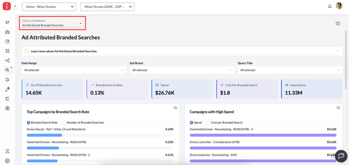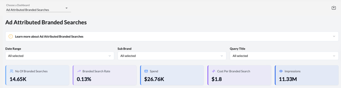 This dashboard helps you understand how ads are driving branded search behavior on Amazon. It shows the number of branded searches, the branded search rate, spend, cost per branded search, and impressions — allowing you to measure how effectively your campaigns build brand awareness and recall.