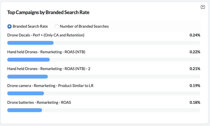 Identifies campaigns most effective in generating branded searches (e.g., Drone Decals Perf+ with 0.24%).