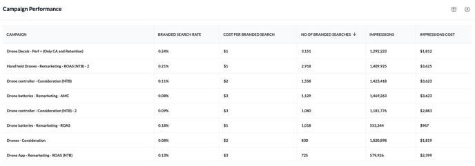 Provides granular breakdown of Branded Search Rate, Cost per Branded Search, No. of Branded Searches, Impressions, and Impressions Cost per campaign.