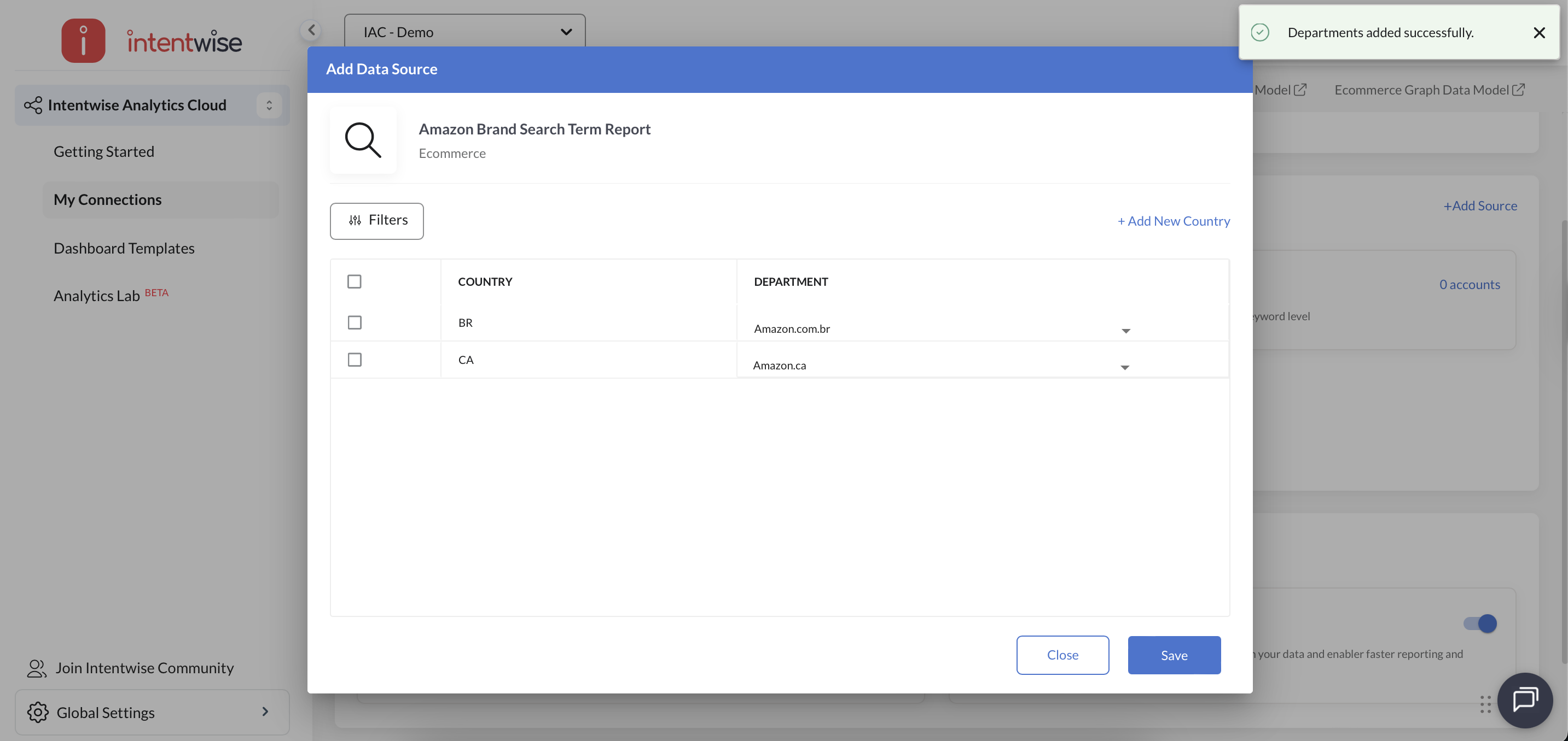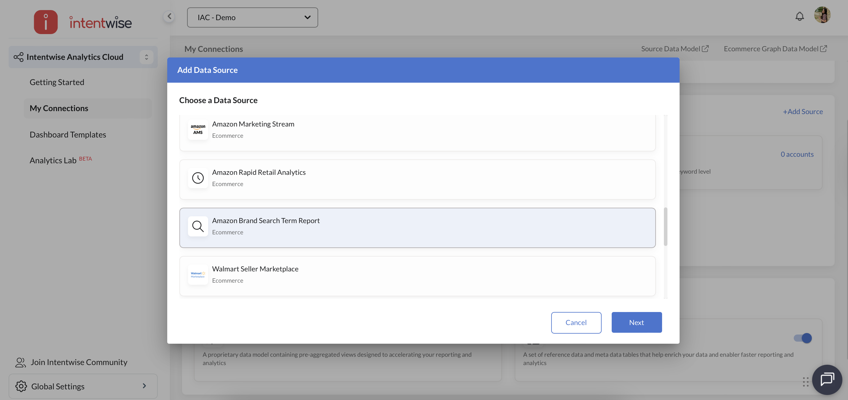 In Intentwise Analytics Cloud (IAC), please click on the “+ Add Source” option in the “My Data Sources” section and then select “Amazon Brand Search Term Report."