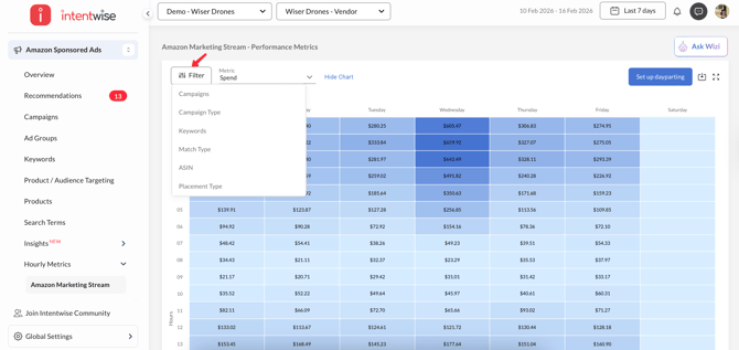 Apply Filters: Analyze the hourly data by campaigns, campaign type, keywords, match type, ASIN, and Placement Type.