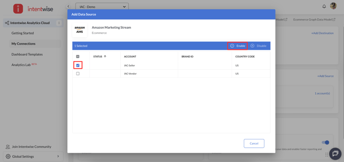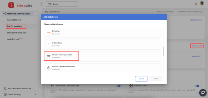 Add Data Source: Add the accounts as data sources by navigating to Intentwise Analytics Cloud > My Connections > Amazon Marketing Stream.