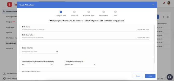 Create a table in your instance: Start by configuring a table in your AMC Instance under 'Data Upload' section.