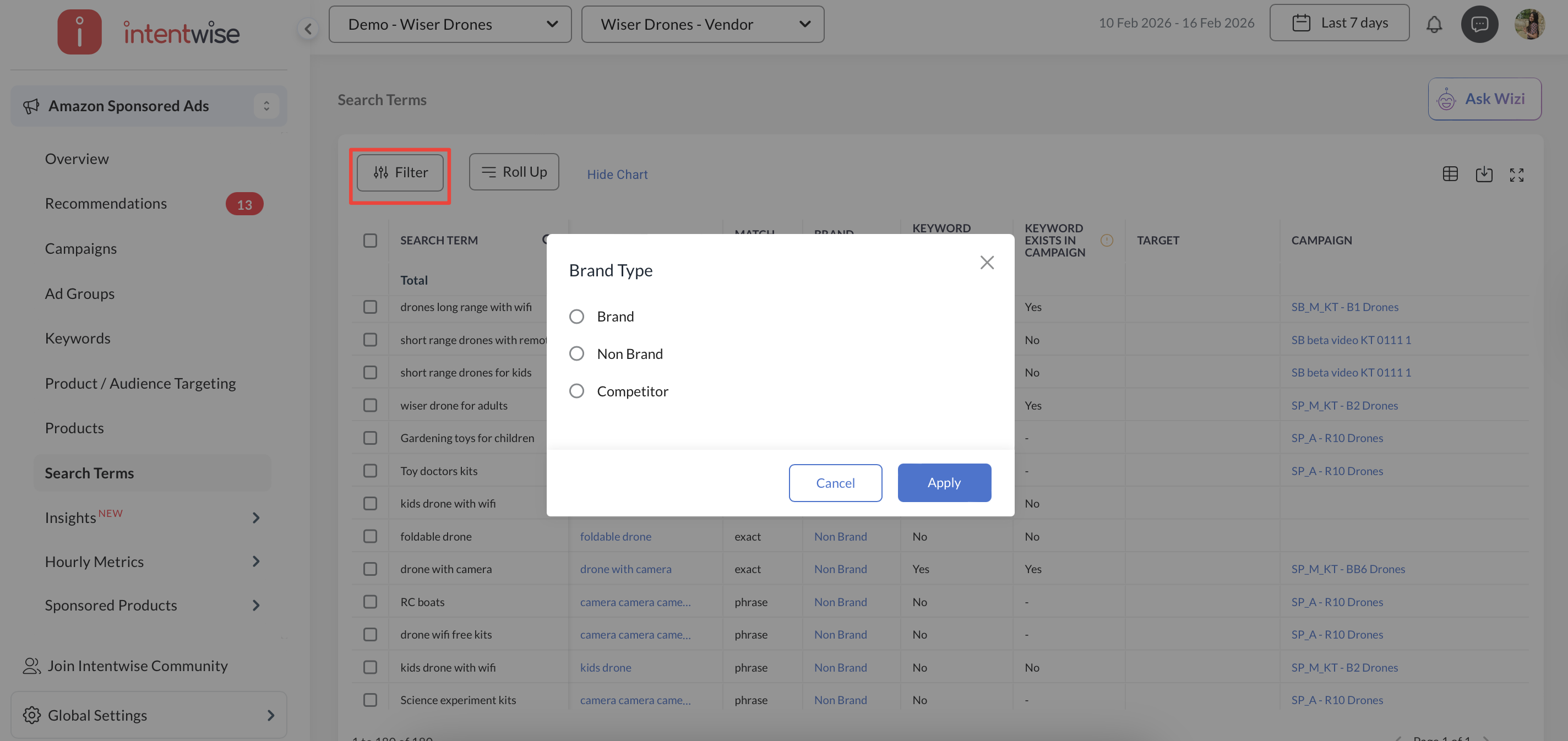 You can use the Brand Type filter (Brand / Competitor / Non-Brand) in the Keywords and Search Terms sections to view performance data.