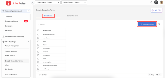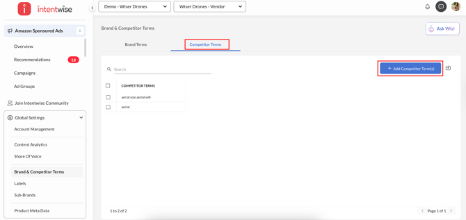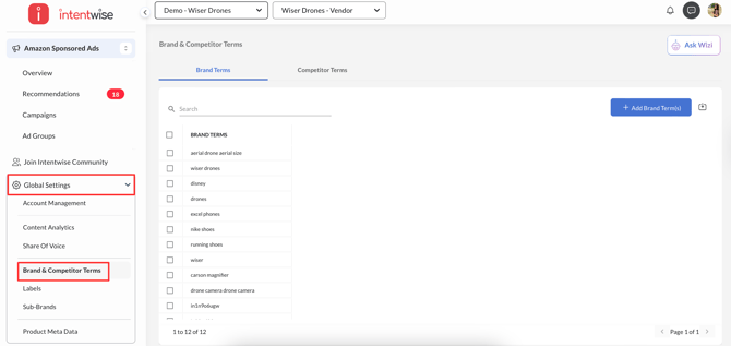 Navigate to the Global Settings in the left menu > Select Brand & Competitor Terms.