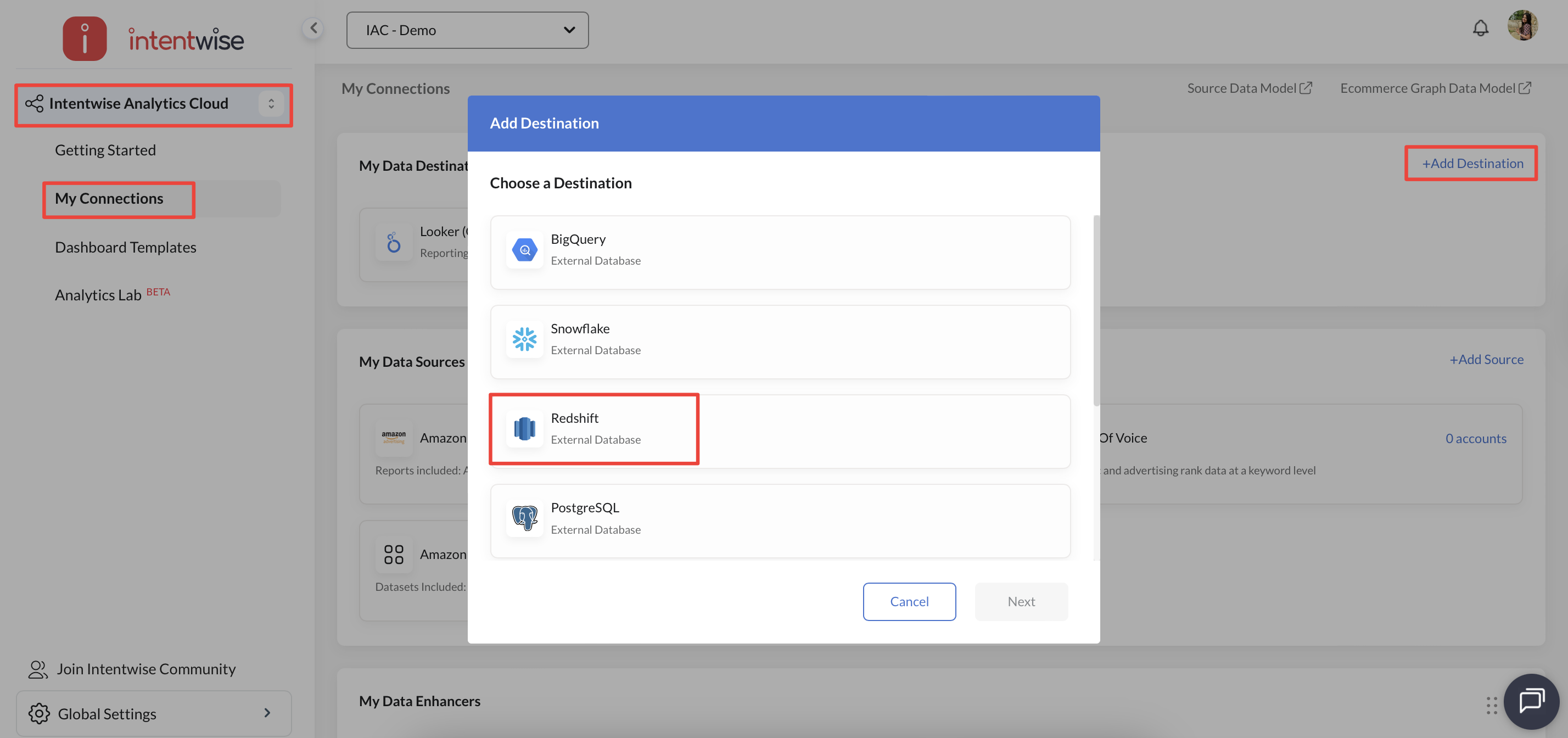 6. Now, go to the Intentwise platform and navigate to My Connections under Intentwise Analytics Cloud. Click on "+ Add Destination", choose Redshift as the destination and click Next.