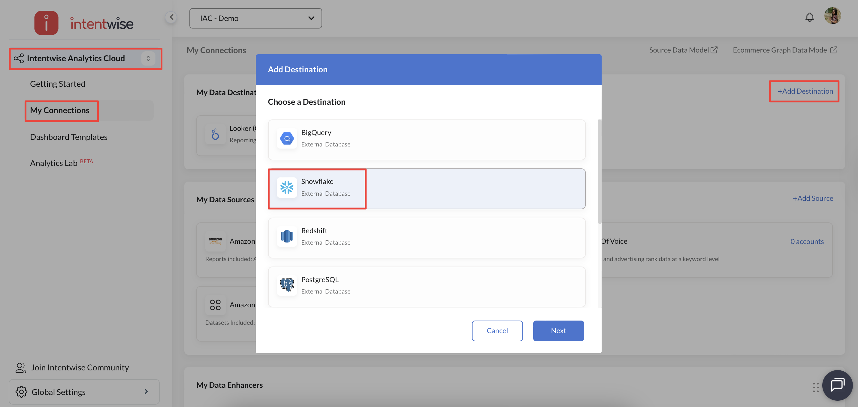 4. Now, login to the Intentwise platform and navigate to My Connections under Intentwise Analytics Cloud. Click on "+ Add Destination", choose Snowflake as the destination and click Next.