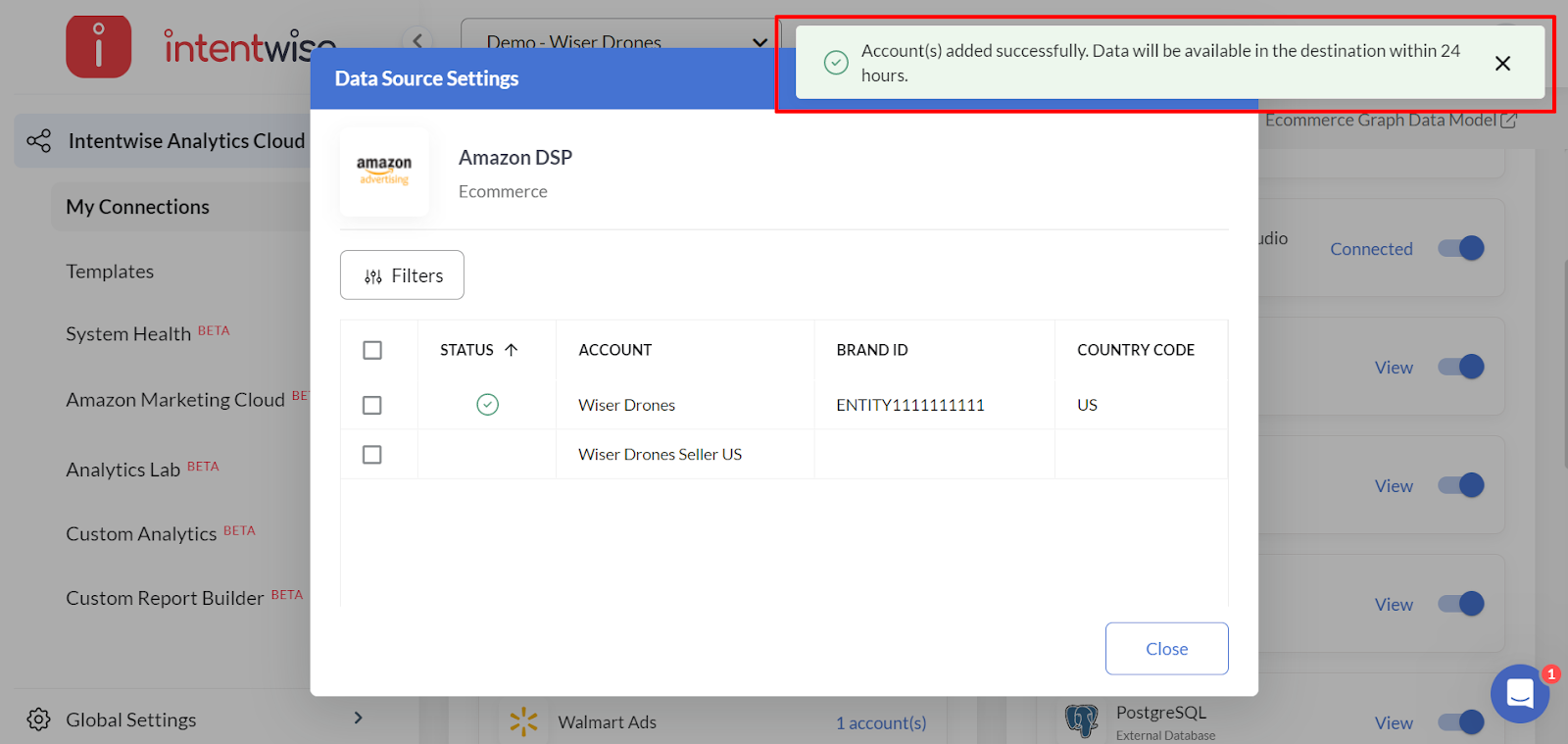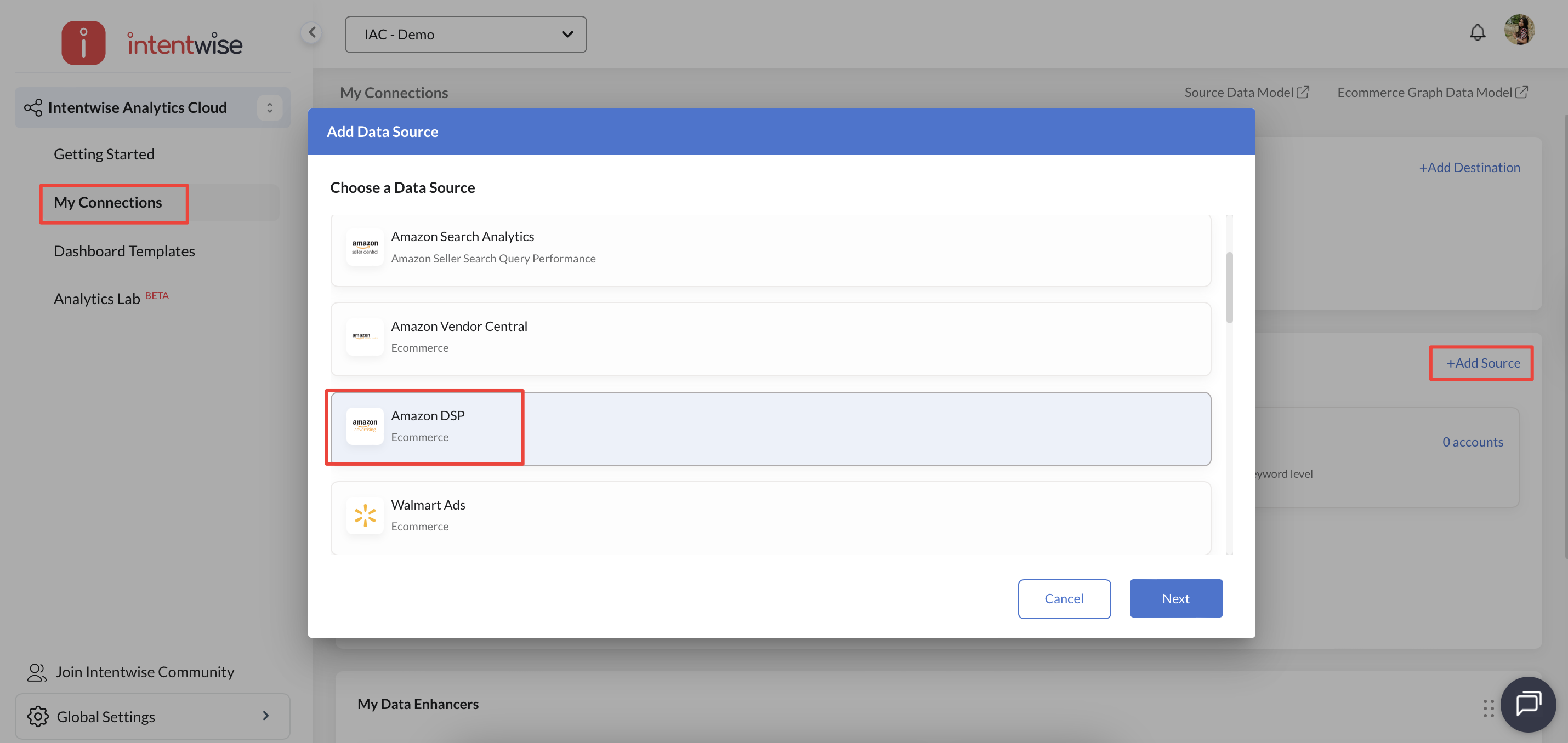 In Intentwise Analytics Cloud (IAC), please click on the “+ Add Source” option in the “My Data Sources” section and then select “Amazon DSP”.