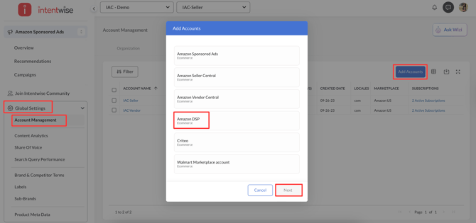Navigate to Account Management under Global Setting > Accounts tab > Add Accounts > DSP and click on Next