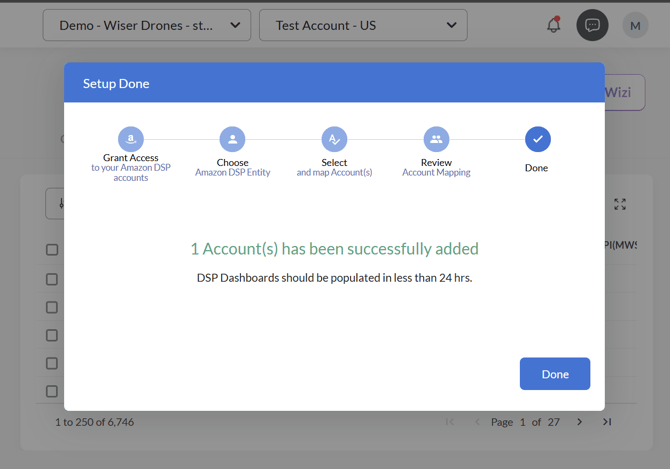 On successful completion, you'll see the below success message. The setup takes around 24 hours. You'll be notified via email once it is complete. You can then see the accounts in the Account Management > Accounts tab.