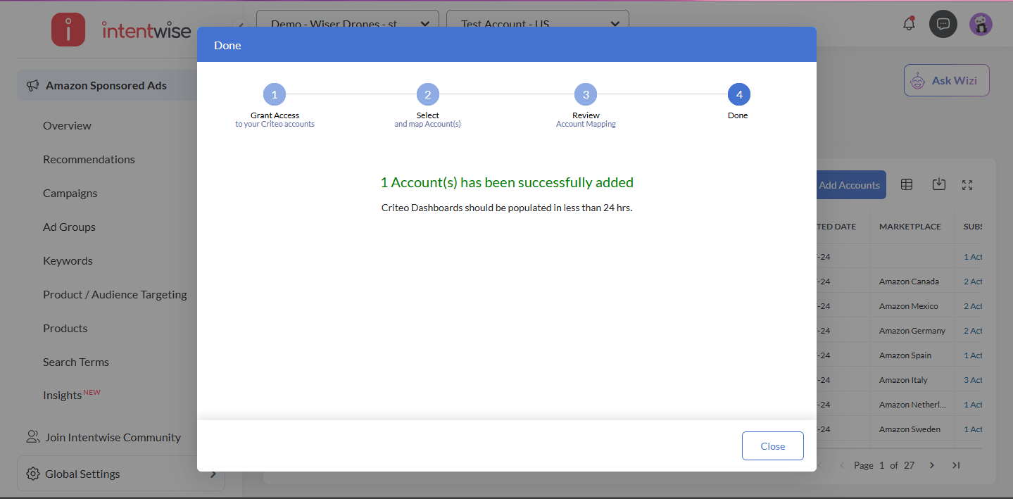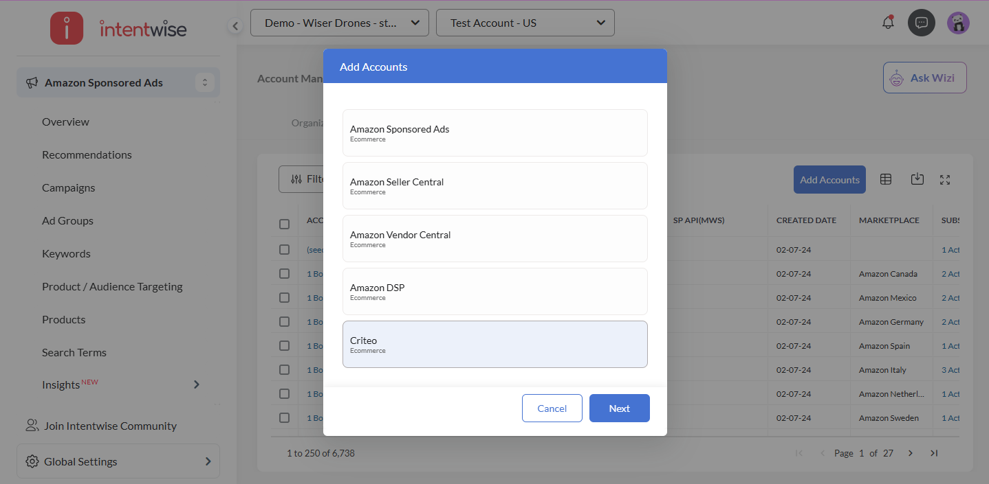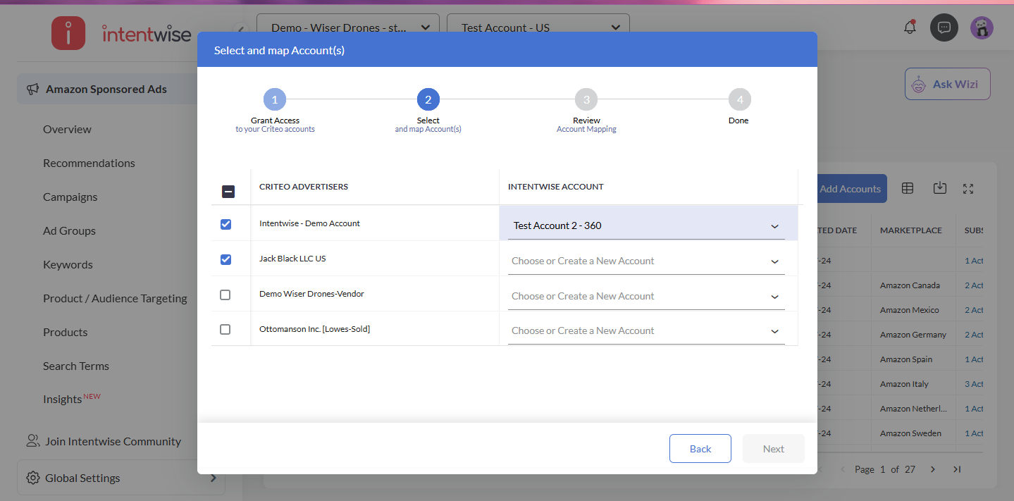 Please Note:- If you don't have a corresponding account on Intentwise Platform, you can create a new one, which will be a Criteo-only account on Intentwise Platform. Once all accounts are mapped, click Next.