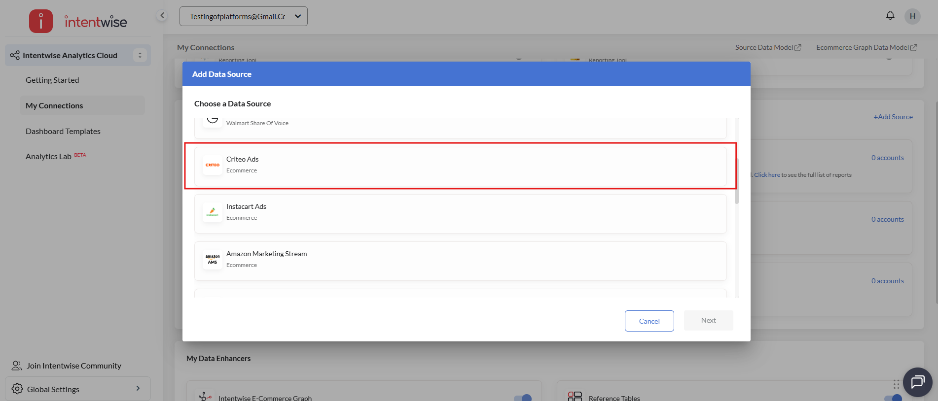Step 1: In Intentwise Analytics Cloud (IAC), please click on the “+ Add Source” option in the “My Data Sources” section and then select “Criteo Ads”.