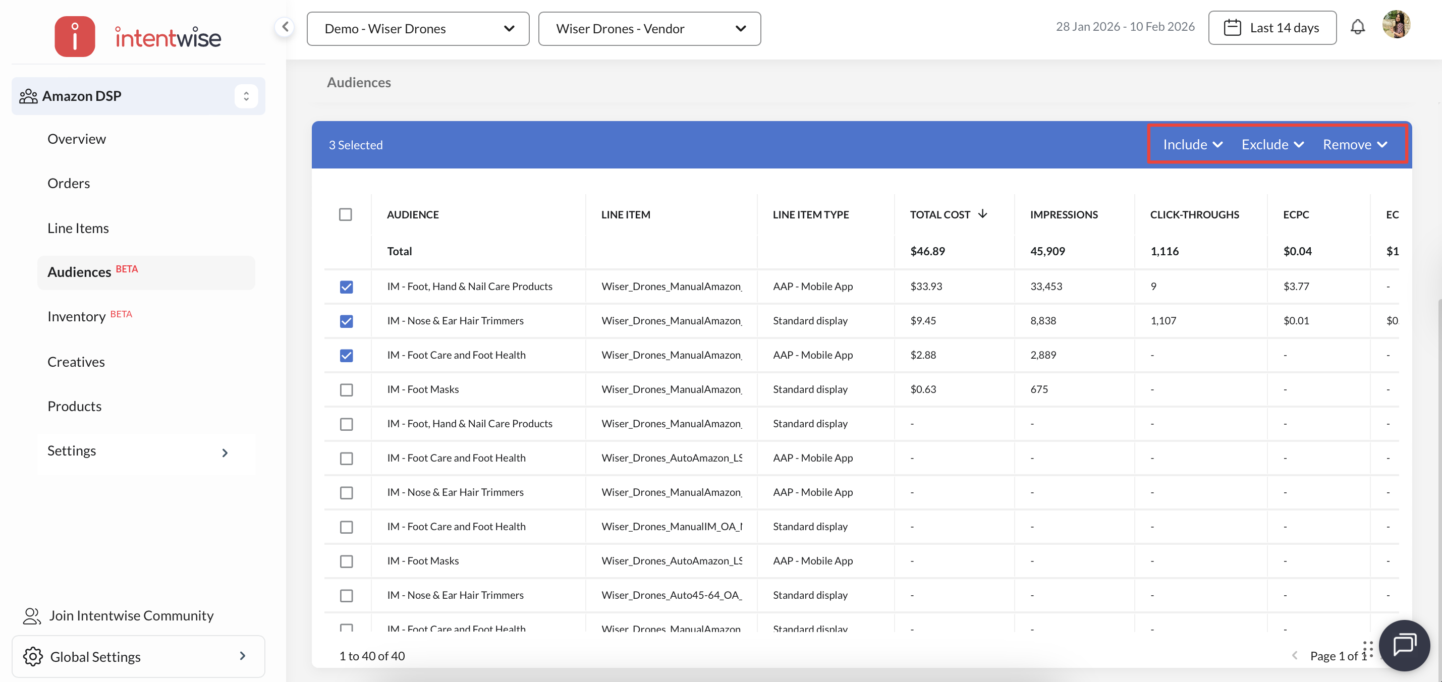 Including, Excluding, and Removing Audiences: Easily include, exclude, or remove audiences from current or multiple orders by selecting multiple line items.