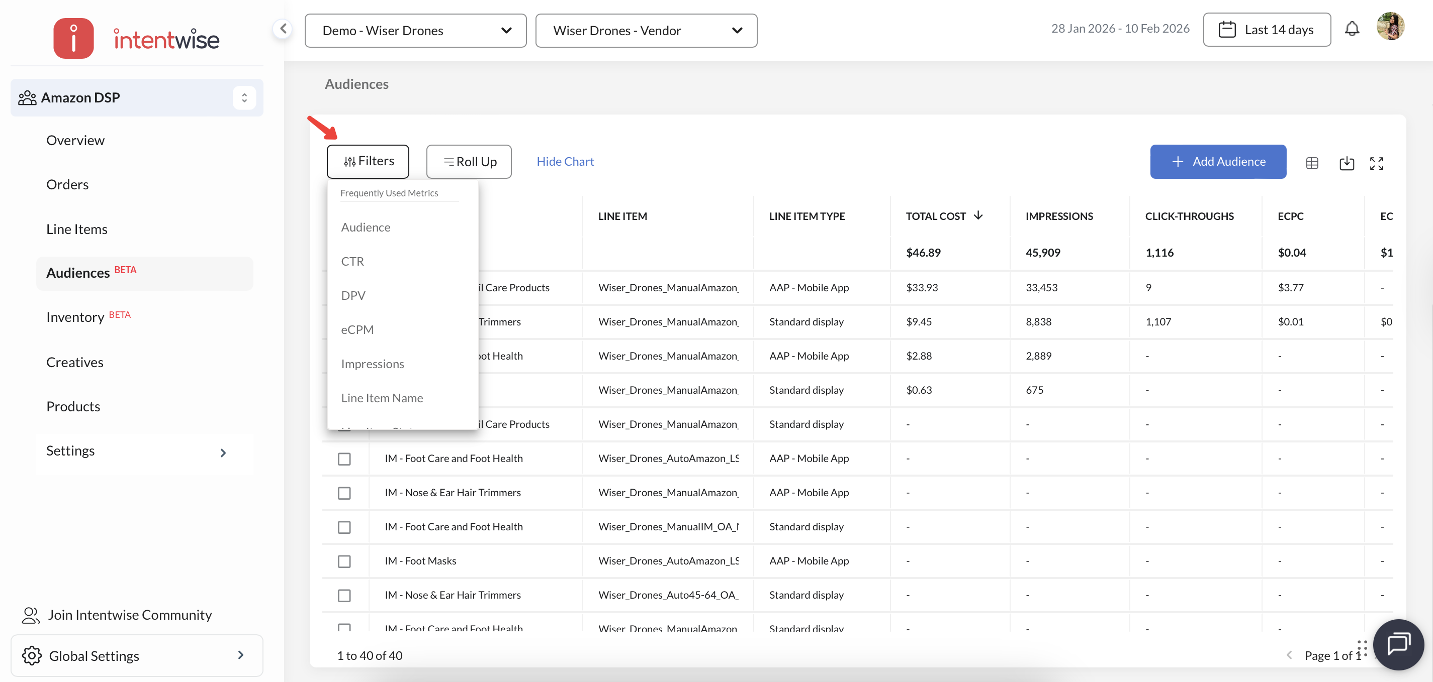 Filters: Apply filters for audience, CTR, DPV, impressions, and more to refine your data view.