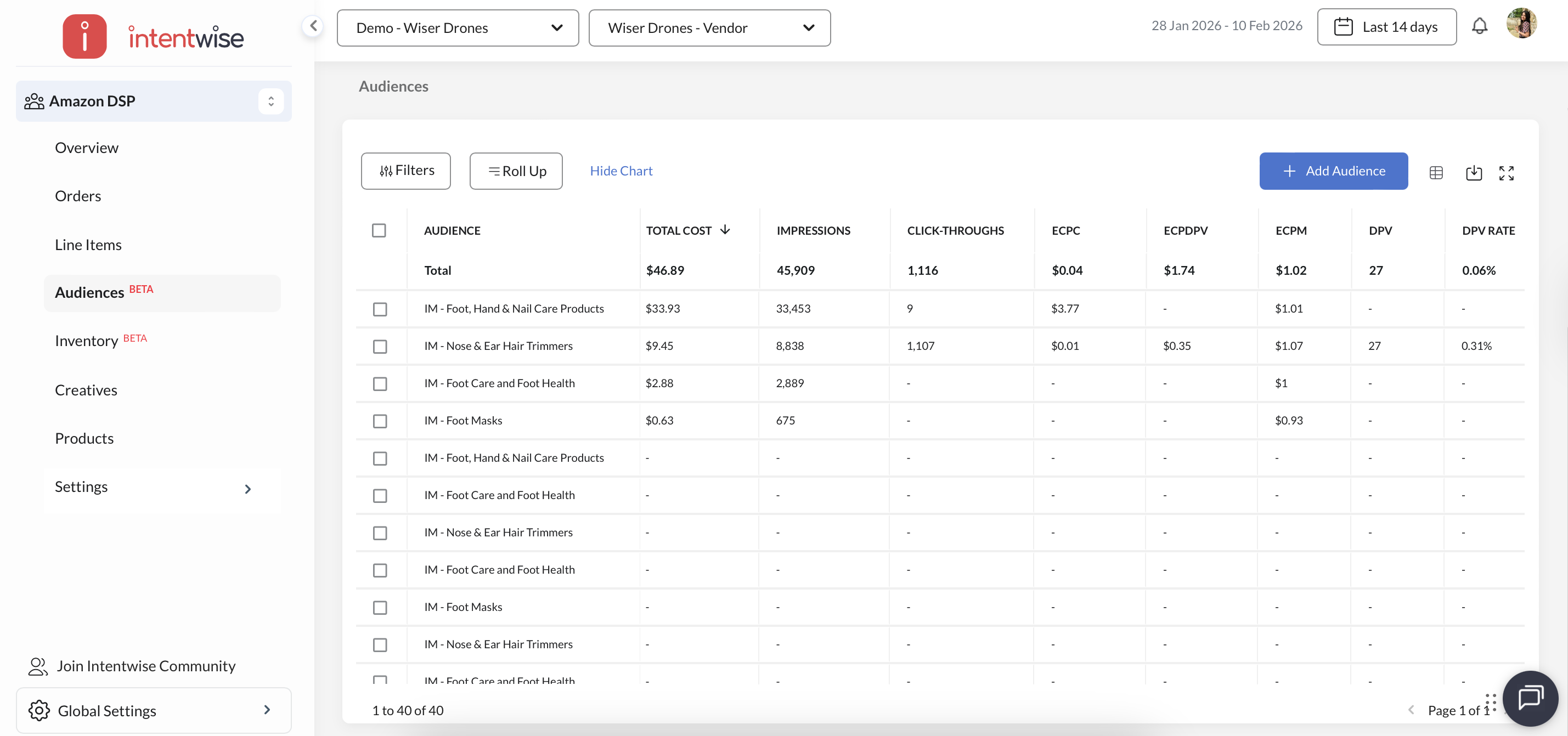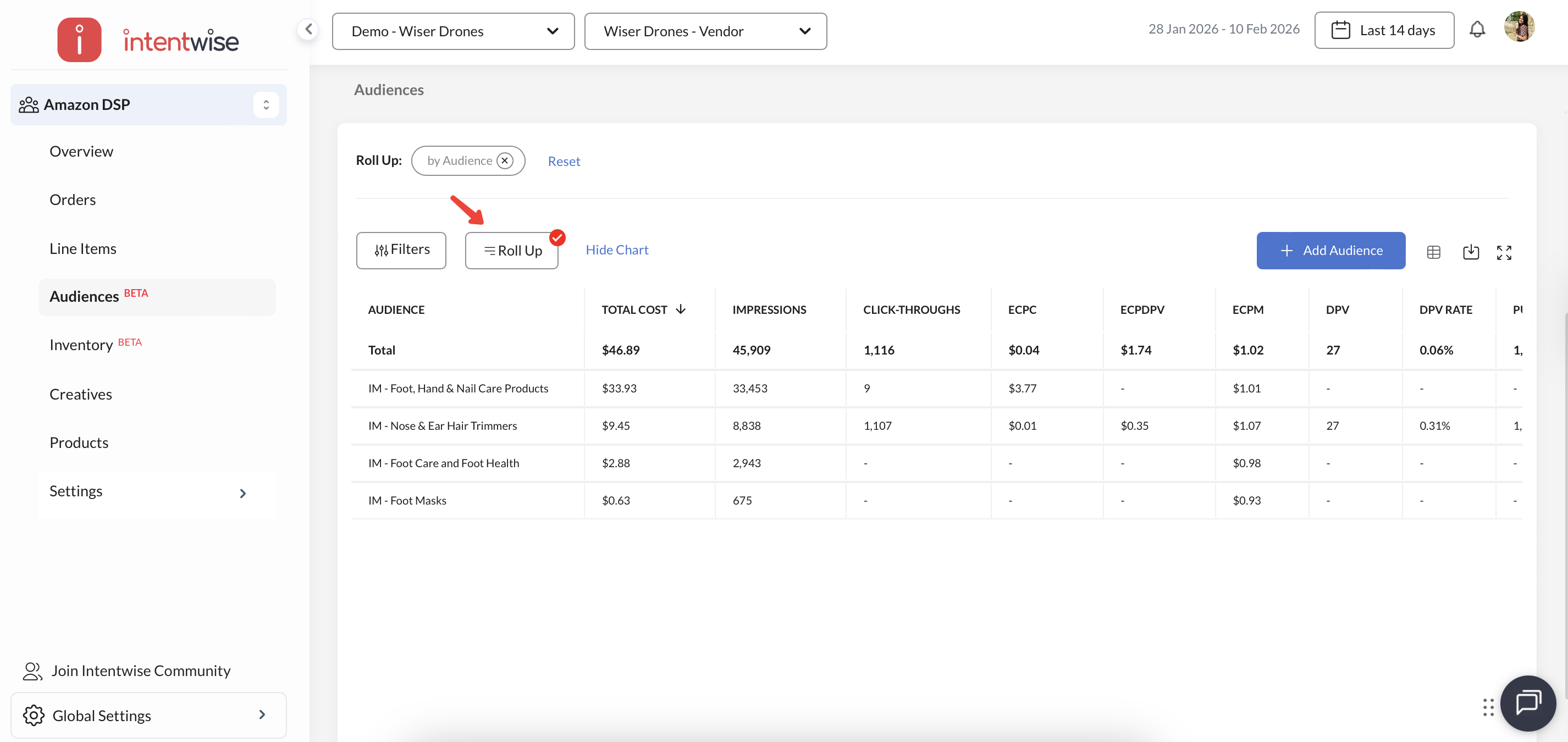 Filters and Roll-Ups: Filters allow you to narrow down data based on specific criteria such as audience, CTR, DPV, impressions, and more, providing focused insights. Roll-ups aggregate data to show summarized views by audience.