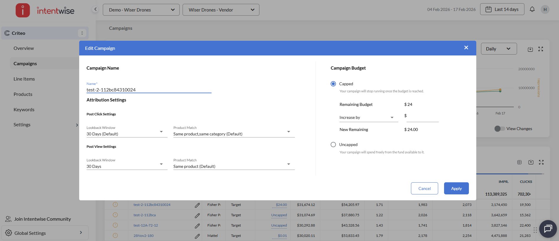 Edit Campaign: Customize your Attribution settings to fit your campaign's goal by selecting which Lookback Window to use and defining the Product Match for both Post-Click and Post-View conversions.