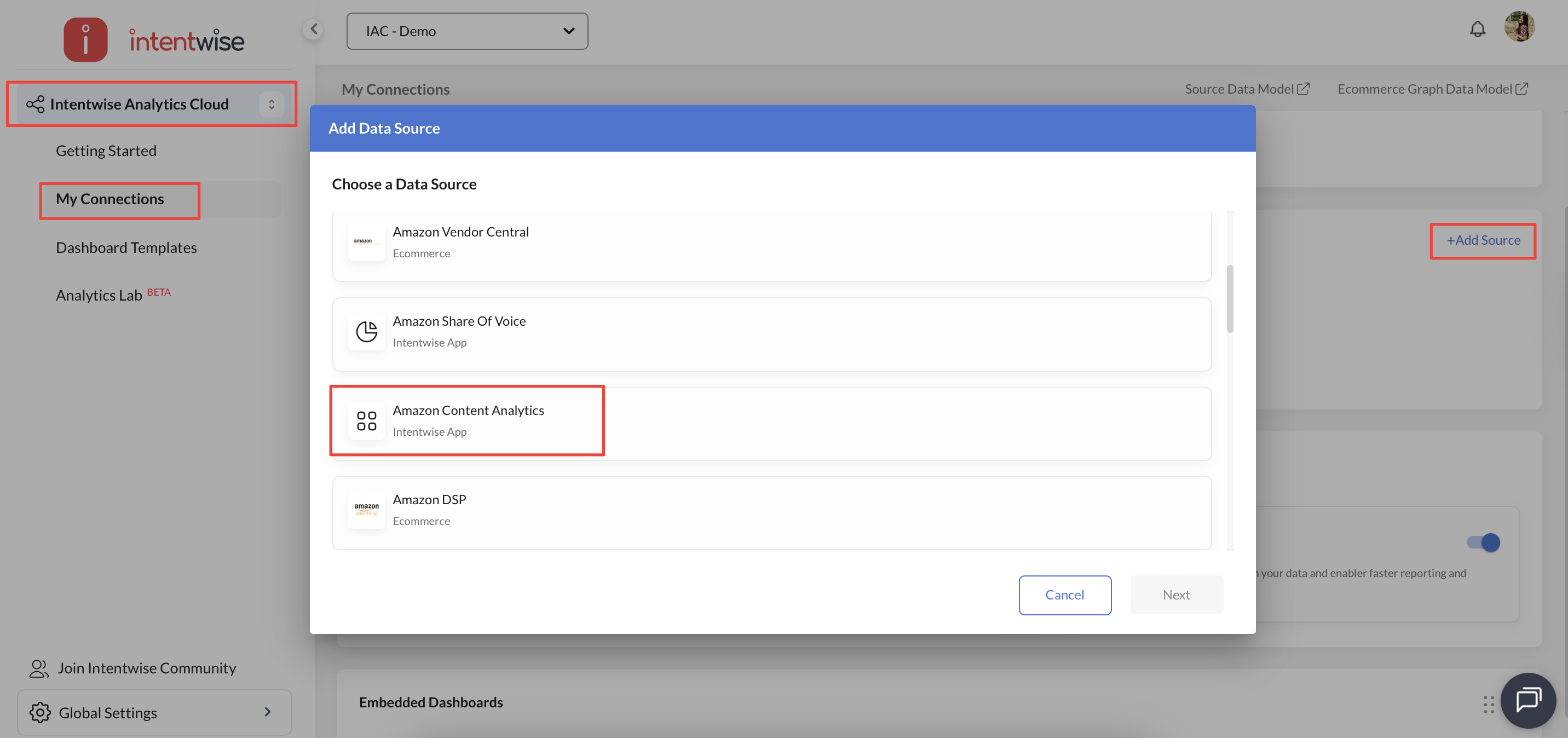 Add Data Source: In My Connections, click on the “+ Add Source” option in the “My Data Sources” section and then select “Content Analytics.”