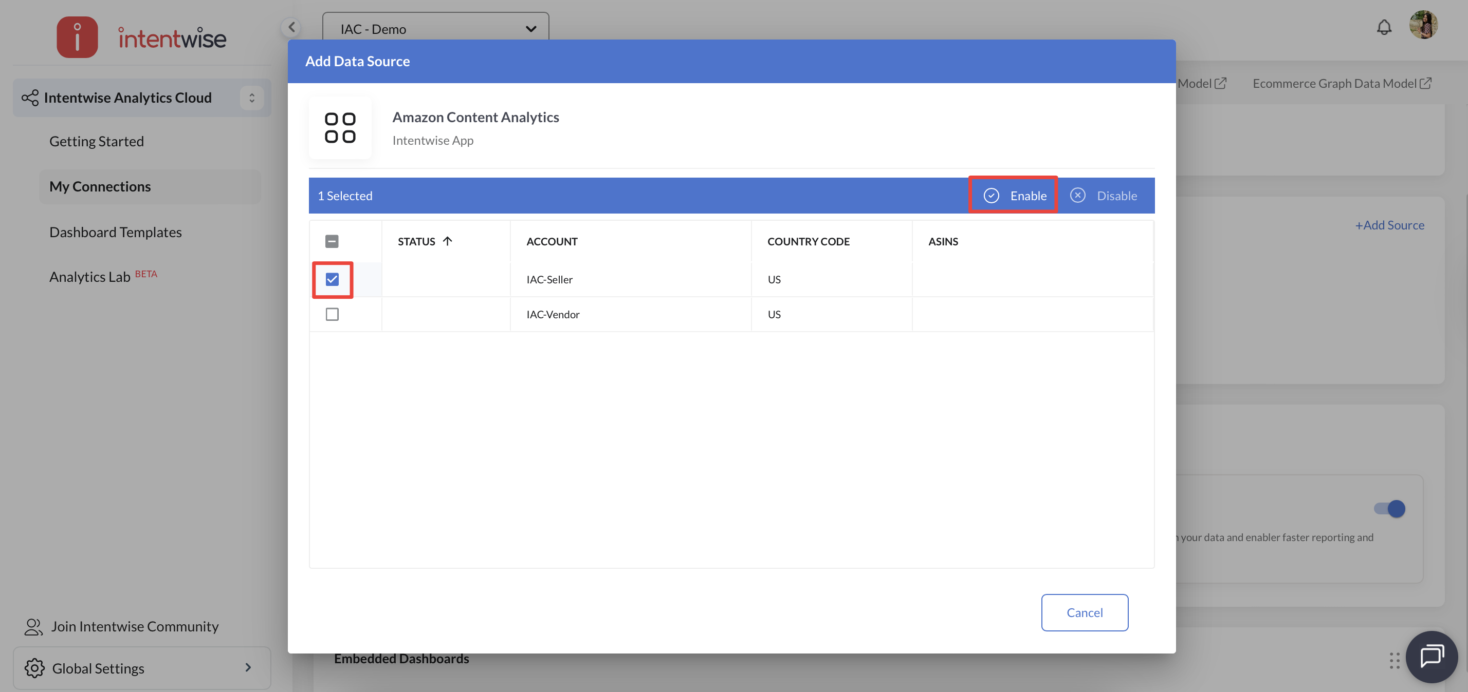Add Accounts: You will then be presented with the “Data Source Settings” screen where you will find all the available accounts for which Content Analytics has been enabled. You can then select the accounts you want to activate by checking the checkbox and then clicking on the “Enable” option in the top ribbon menu.