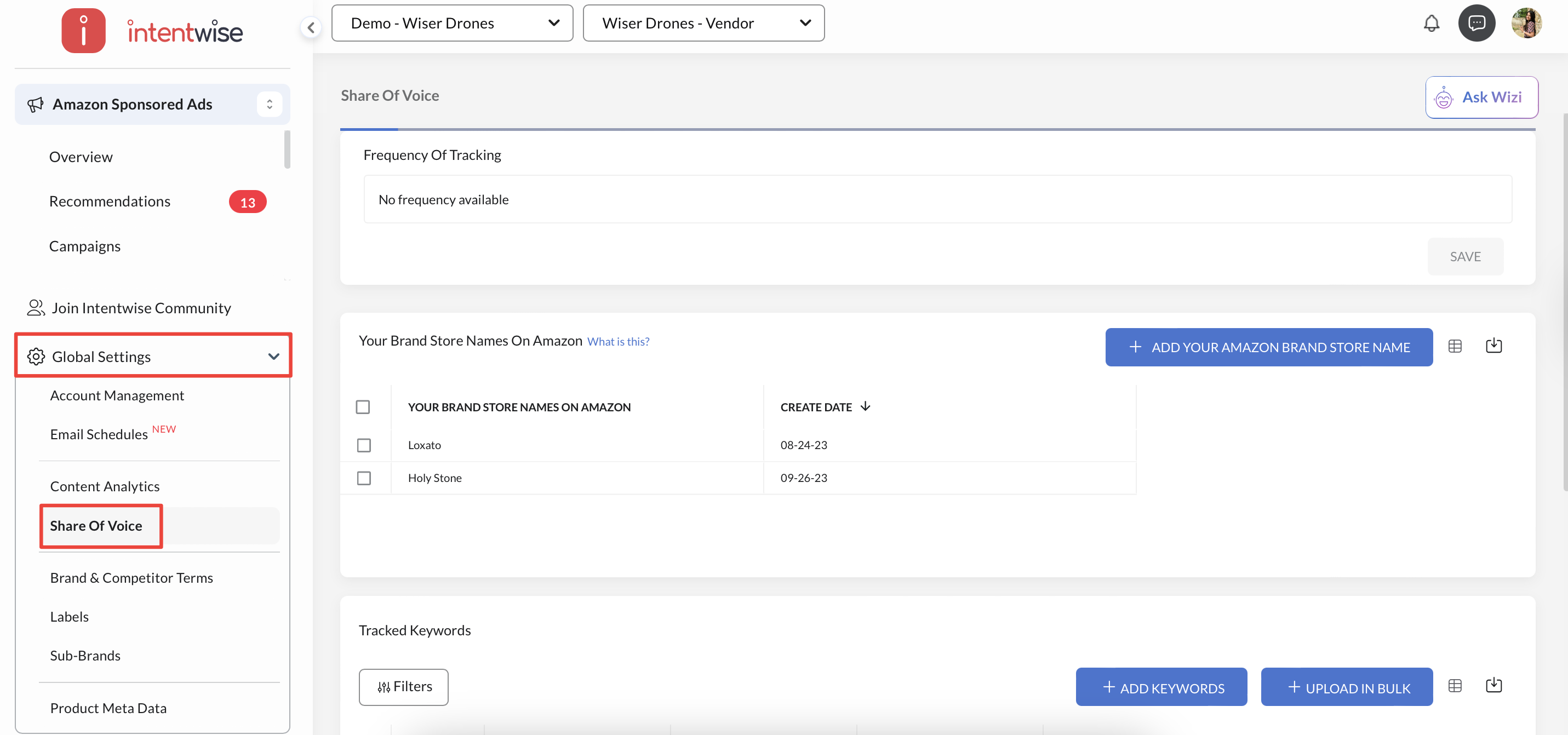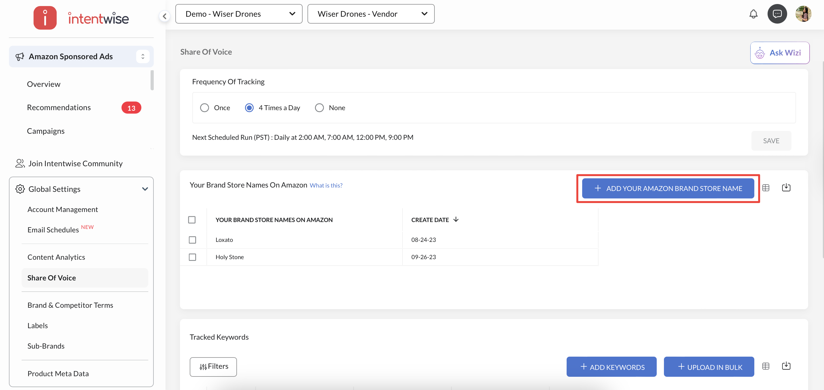 Set up Share of Voice (SOV) by adding your brand names on Amazon, choosing keywords to track, and defining your preferred tracking frequency.