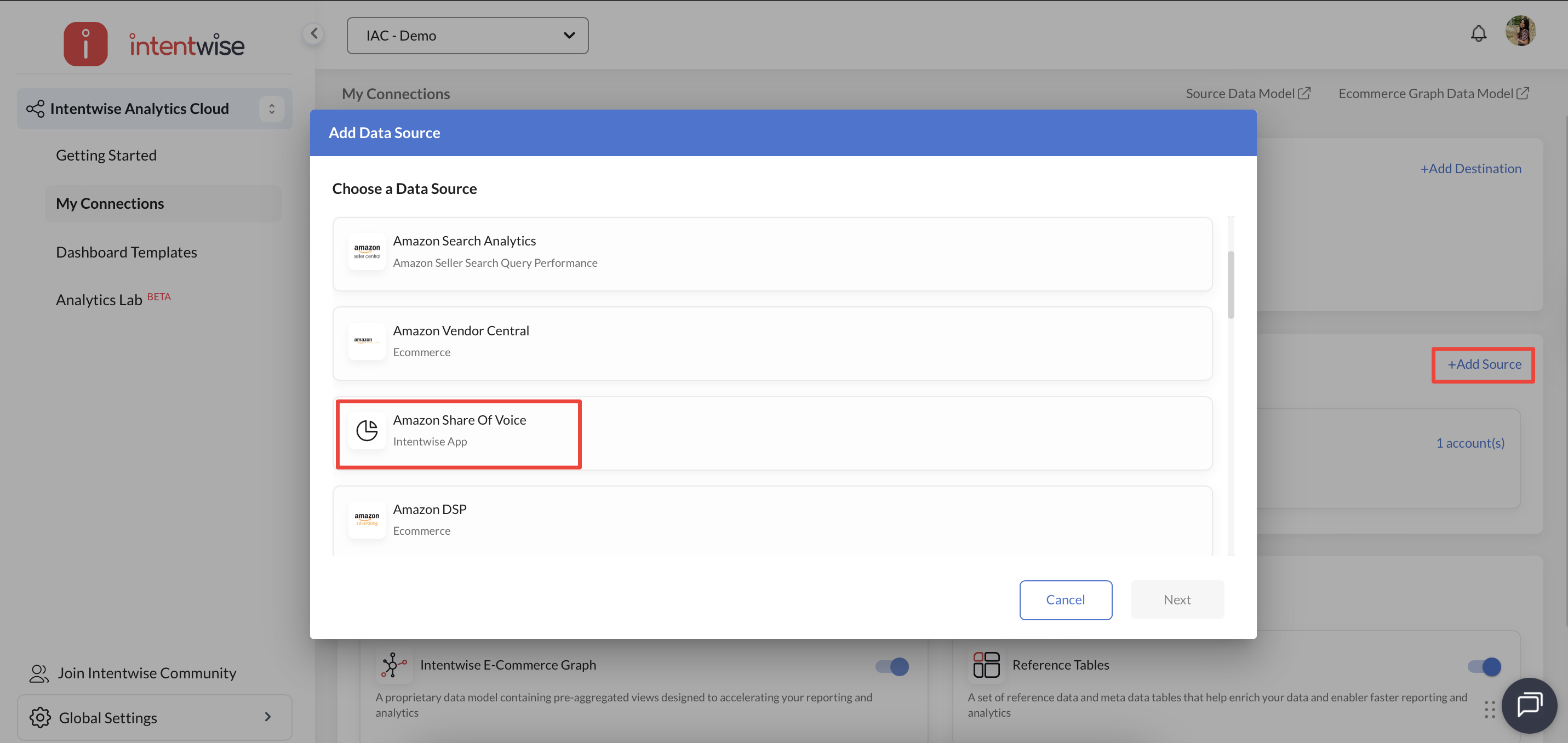 In My Connections, click on the “+ Add Source” option in the “My Data Sources” section and then select “Share of Voice.”