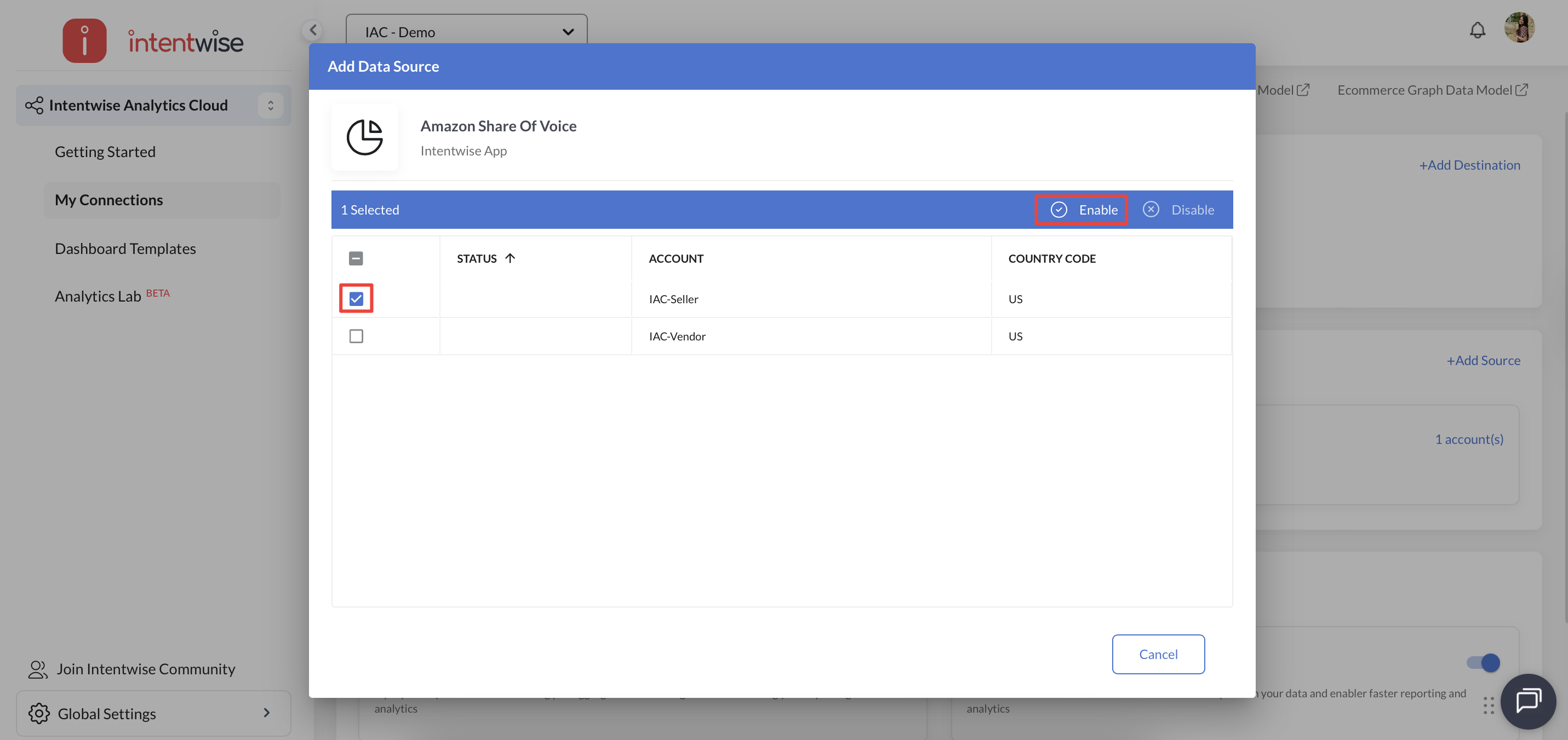 Select Accounts: You will then be presented with the “Data Source Settings” screen where you will find all the available accounts for which Share of Voice has been enabled. You can then select the accounts you want to activate by checking the checkbox and then clicking on the “Enable” option in the top ribbon menu.