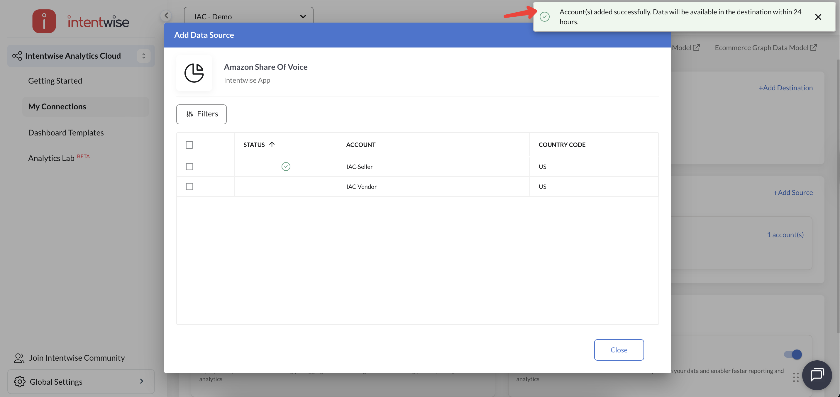 You will then receive a confirmation notification regarding the account addition. Please note that it will take about 24 hours after enabling the account to access the data.