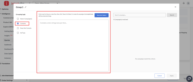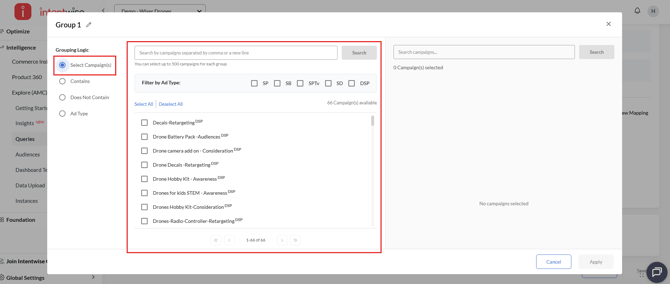 Choose specific campaigns using filter conditions. The selected campaigns remain fixed and do not change over time. This method allows you to select up to 500 campaigns.