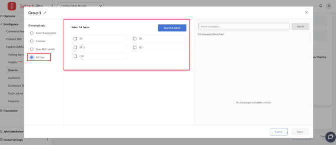 Select one or more ad types. Campaigns are dynamically included based on the selected ad types during query execution.