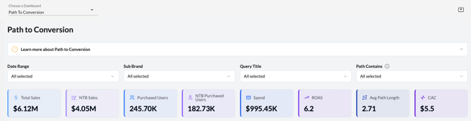 Track how customers interact with multiple ad touchpoints before purchase using the Path to Conversion dashboard, and optimize spend for higher ROAS and NTB growth.