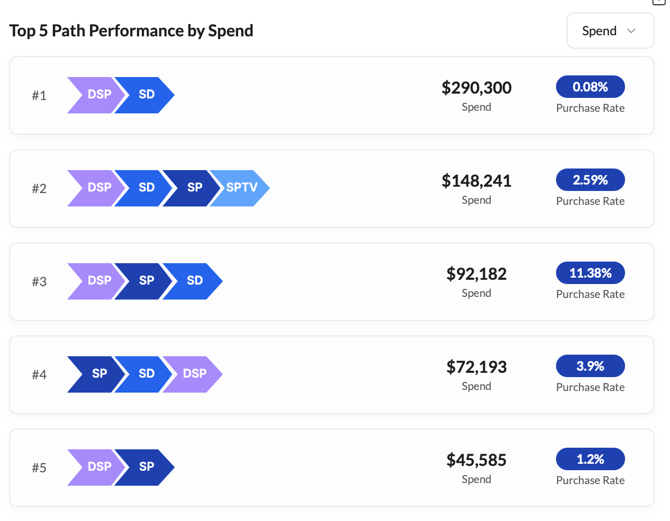DSP → SD drove $290K in spend but had a low purchase rate of 0.08%.