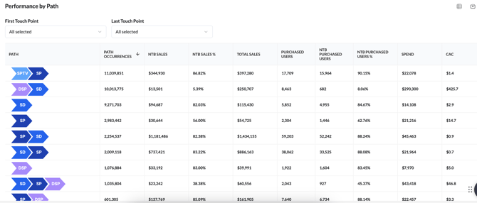 Use first-touch vs. last-touch paths to separate prospecting strategies (DSP, SPTV) from conversion-focused ads (SP, SD).