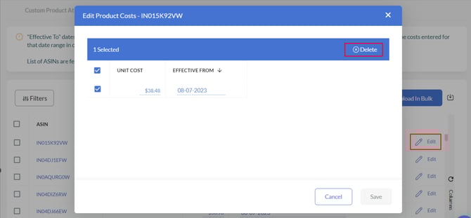 A .csv file would be downloaded. Enter the Unit Cost and Effective From date and upload the .csv file to update the changes on the platform.
