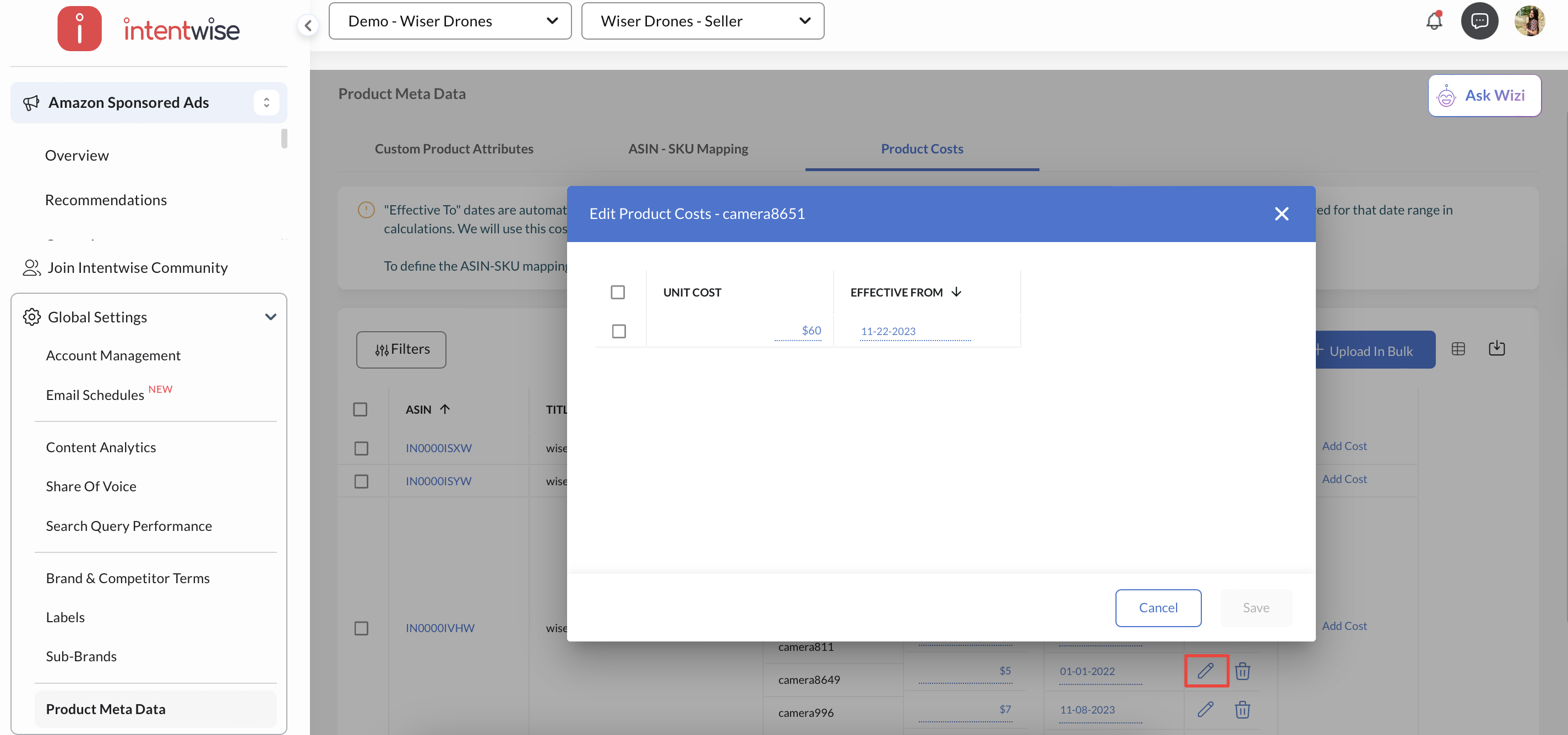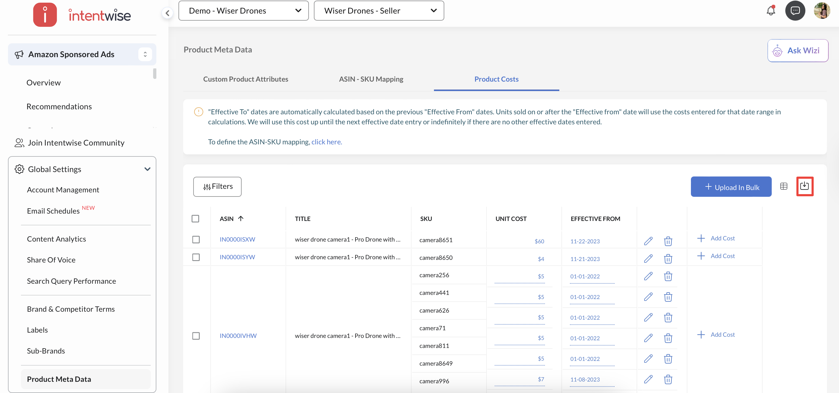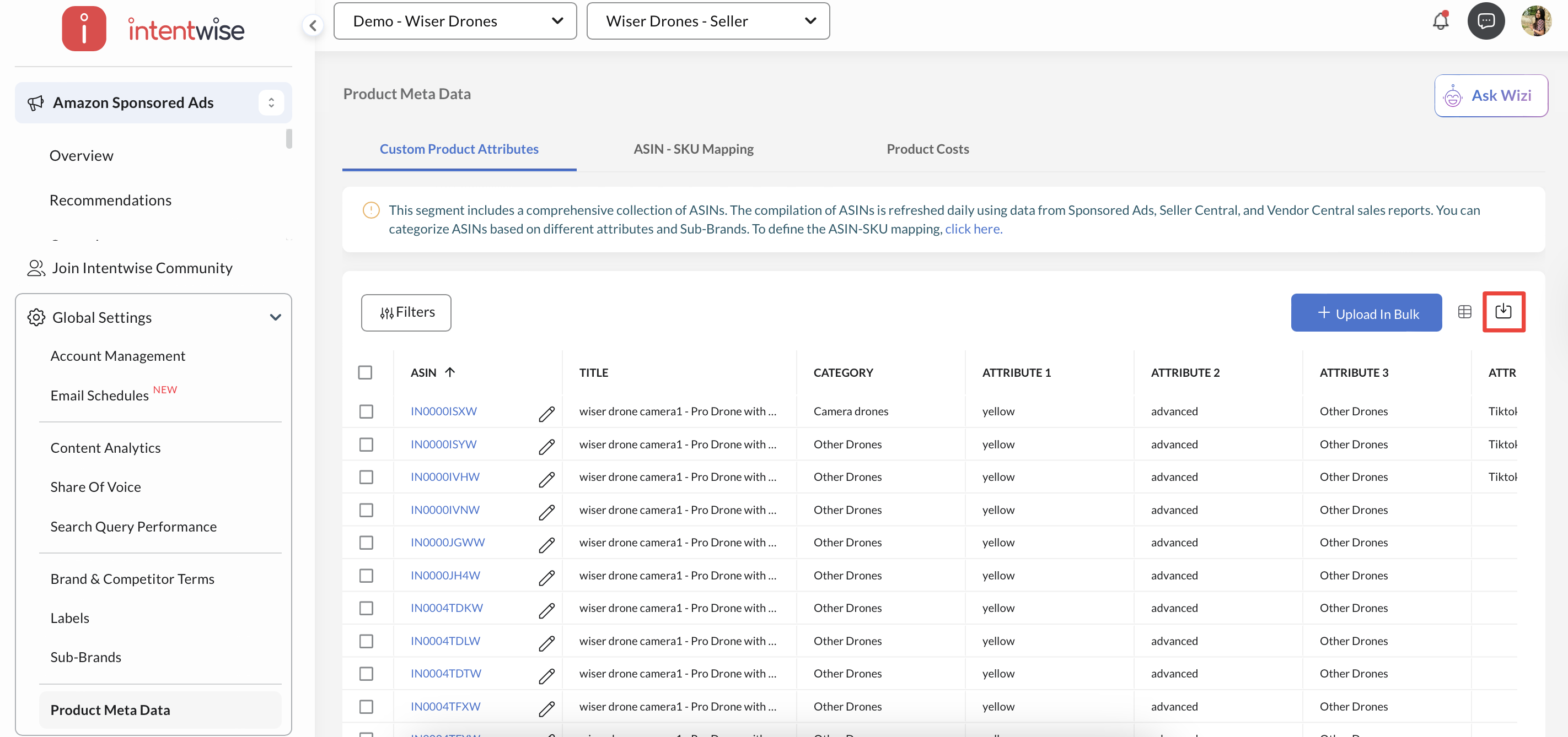 Custom Product Attributes and Product Costs are integral components of the Product Meta Data, helping provide quicker and more straightforward analysis within the Intentwise Analytics Cloud.
