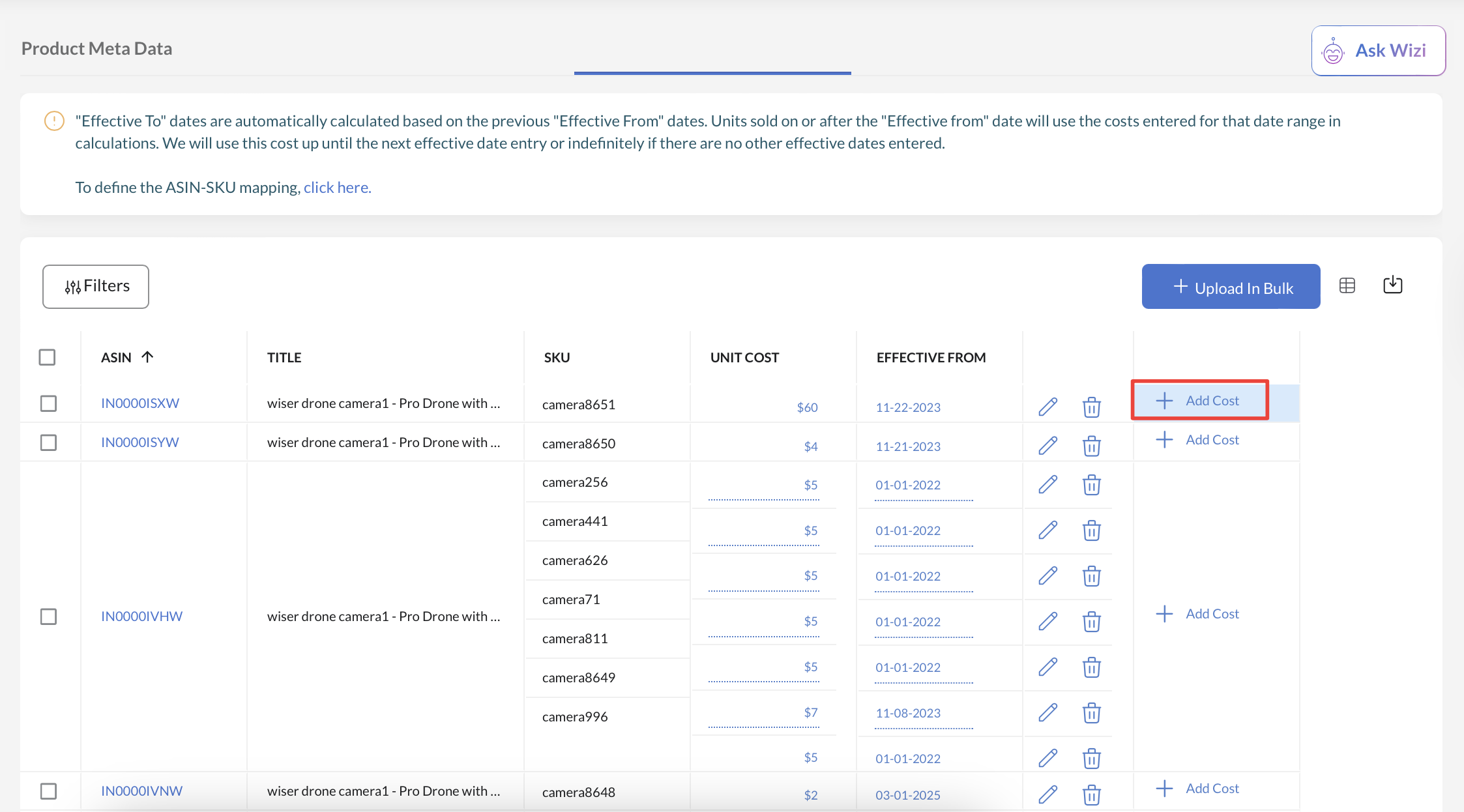 The current ASIN, product title, Unit Cost, and latest effective date.