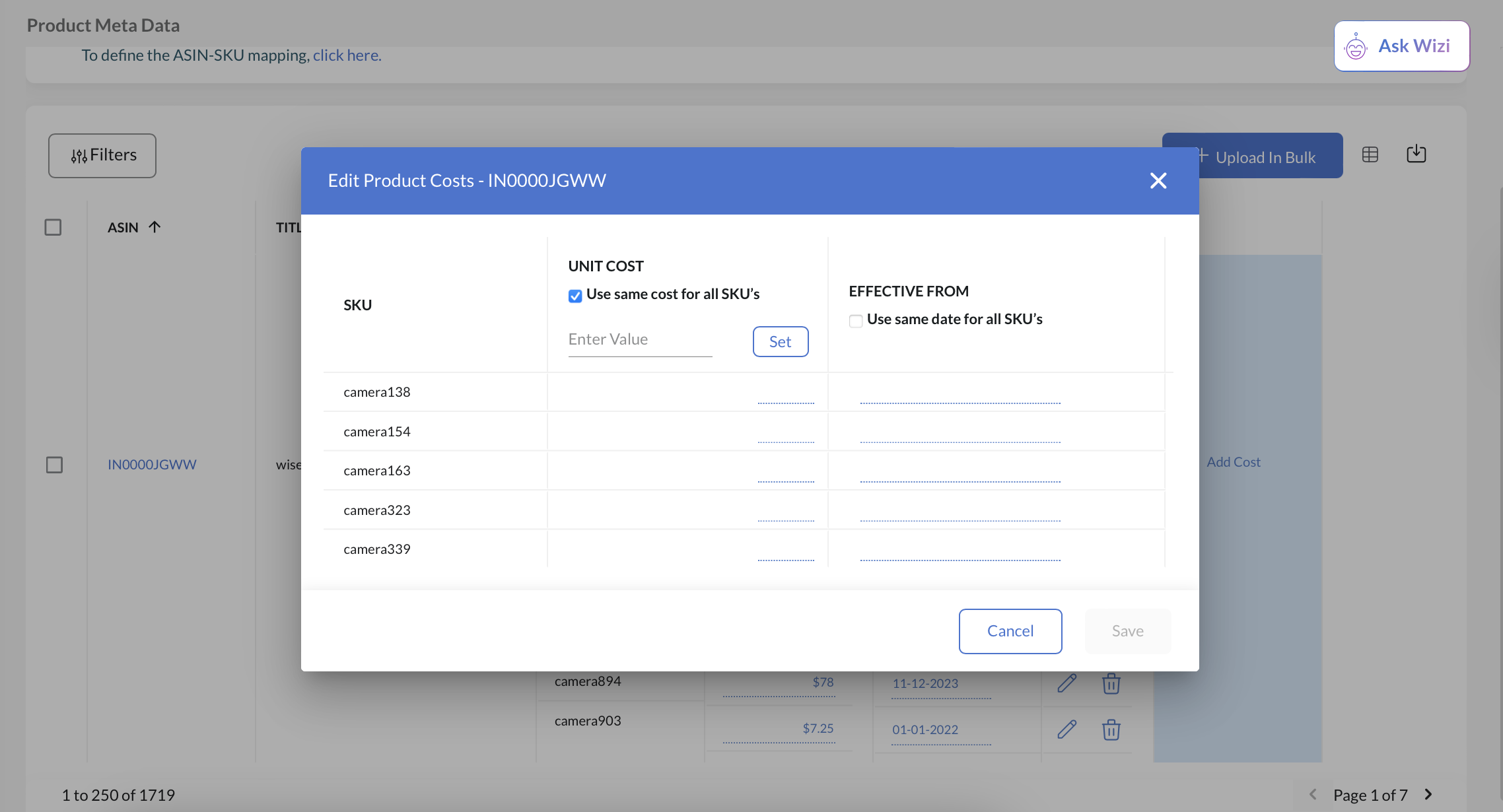 In the case of multiple SKUs, you can select the Use same cost for all SKUs option and set the unit cost to all SKUs at once.