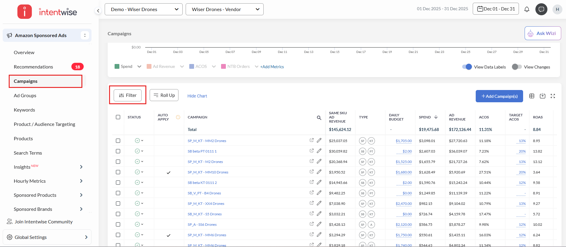 Create a set of saved filters across dashboards and accounts to simplify your day to day Amazon Advertising activities.