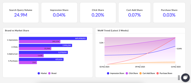 Track impressions, clicks, cart adds, and purchases for the top queries tied to your catalog.