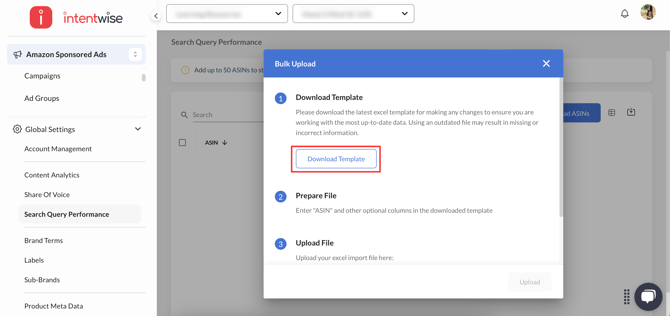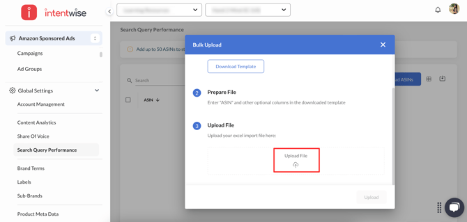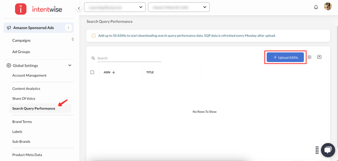 - Complete the Setup: To add the ASINs, go to Global Settings > Search Query Performance section. Click on the "Upload ASINs" button.