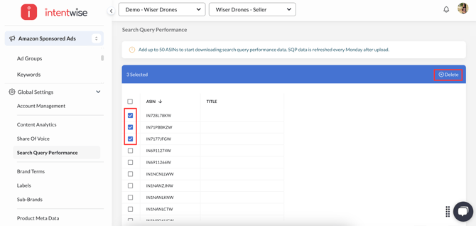 The Search Query Performance dashboard is available under Insights in Intentwise Ad Optimizer. You can upload up to 50 ASINs to track shopper search behavior and refine your advertising strategy. You can update or remove your selected ASINs anytime.