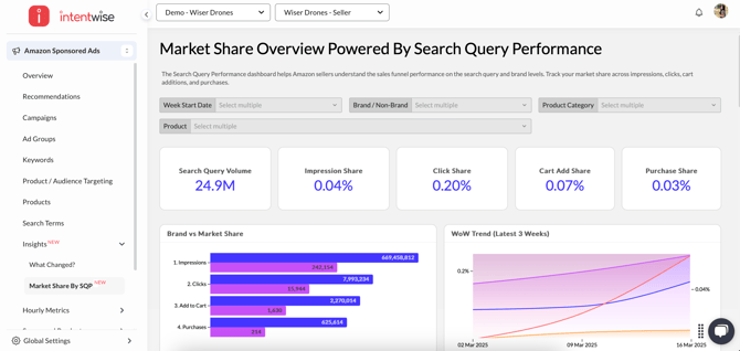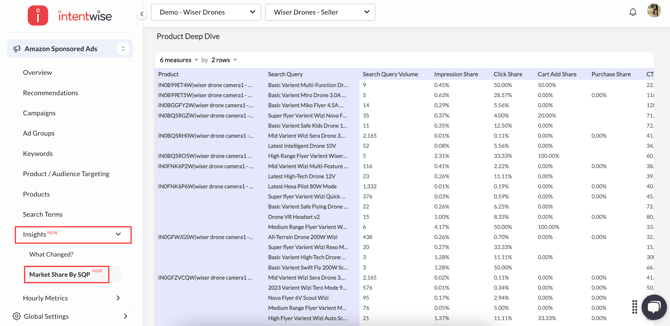 - Navigation: Go to Insights > Market Share by SQP in Intentwise Ad Optimizer.