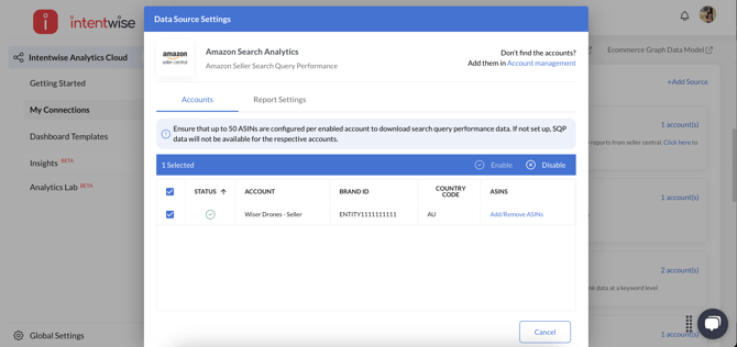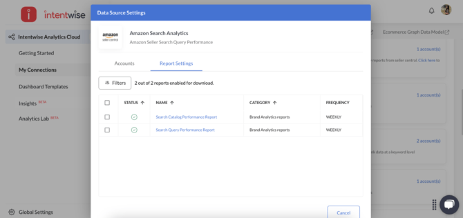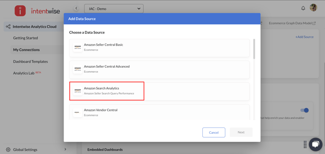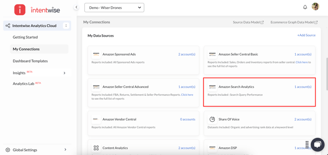 Search Query Performance data is also accessible through Intentwise Analytics Cloud (IAC). The setup process stays the same, but you can now add Amazon Search Analytics as a data source to send the data to your destination. This lets you pull SQP data along with your other retail and advertising metrics to create custom dashboards, automate reporting, and dive deeper into search behavior and performance analysis.