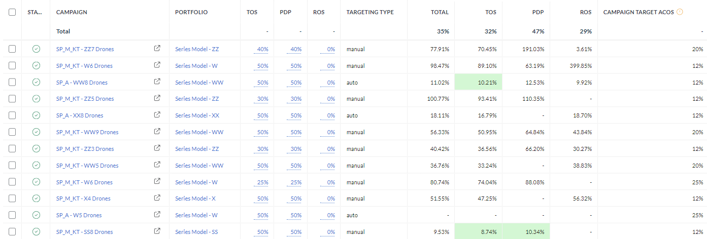 Any placement ACOS that is below a campaign's target ACOS will be highlighted in green.
