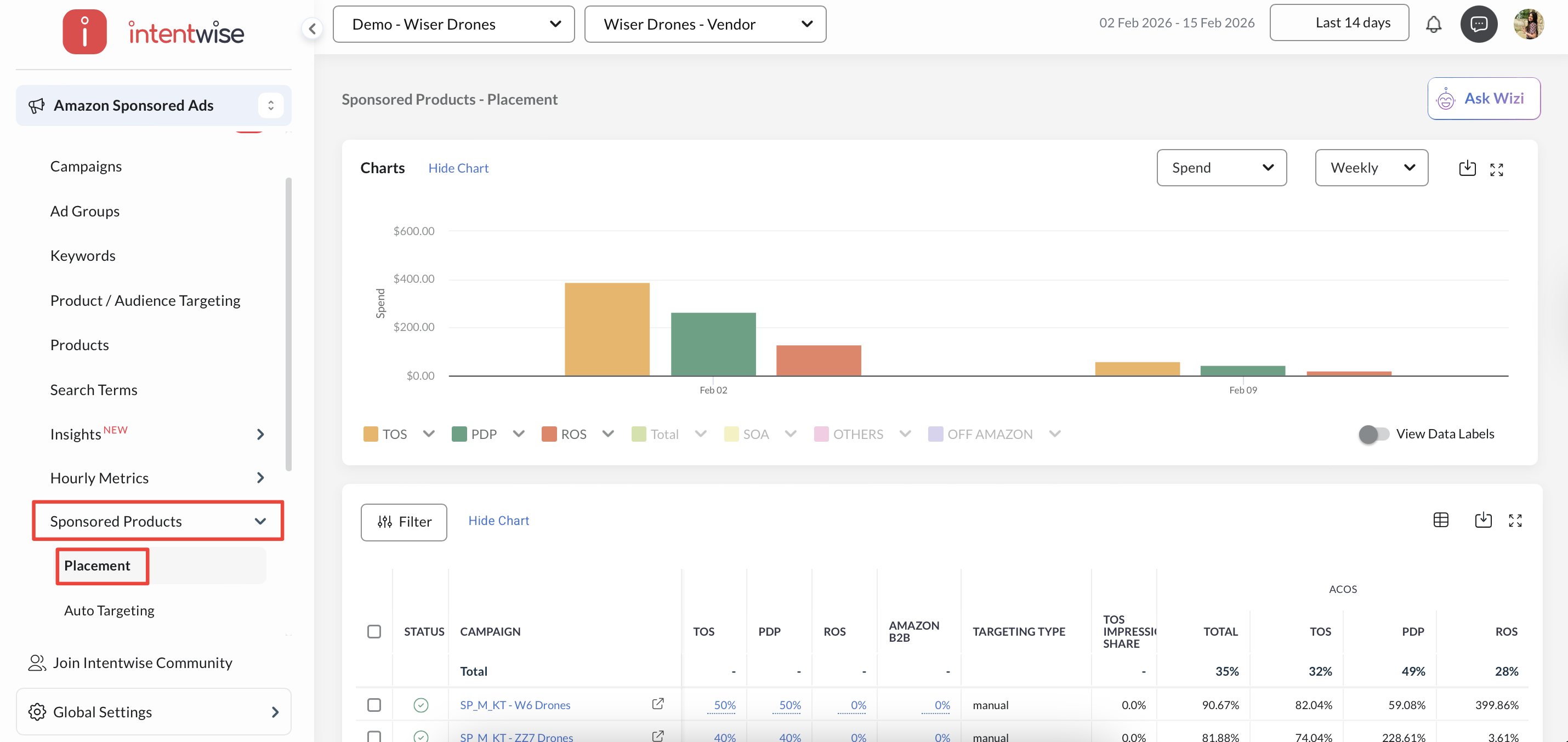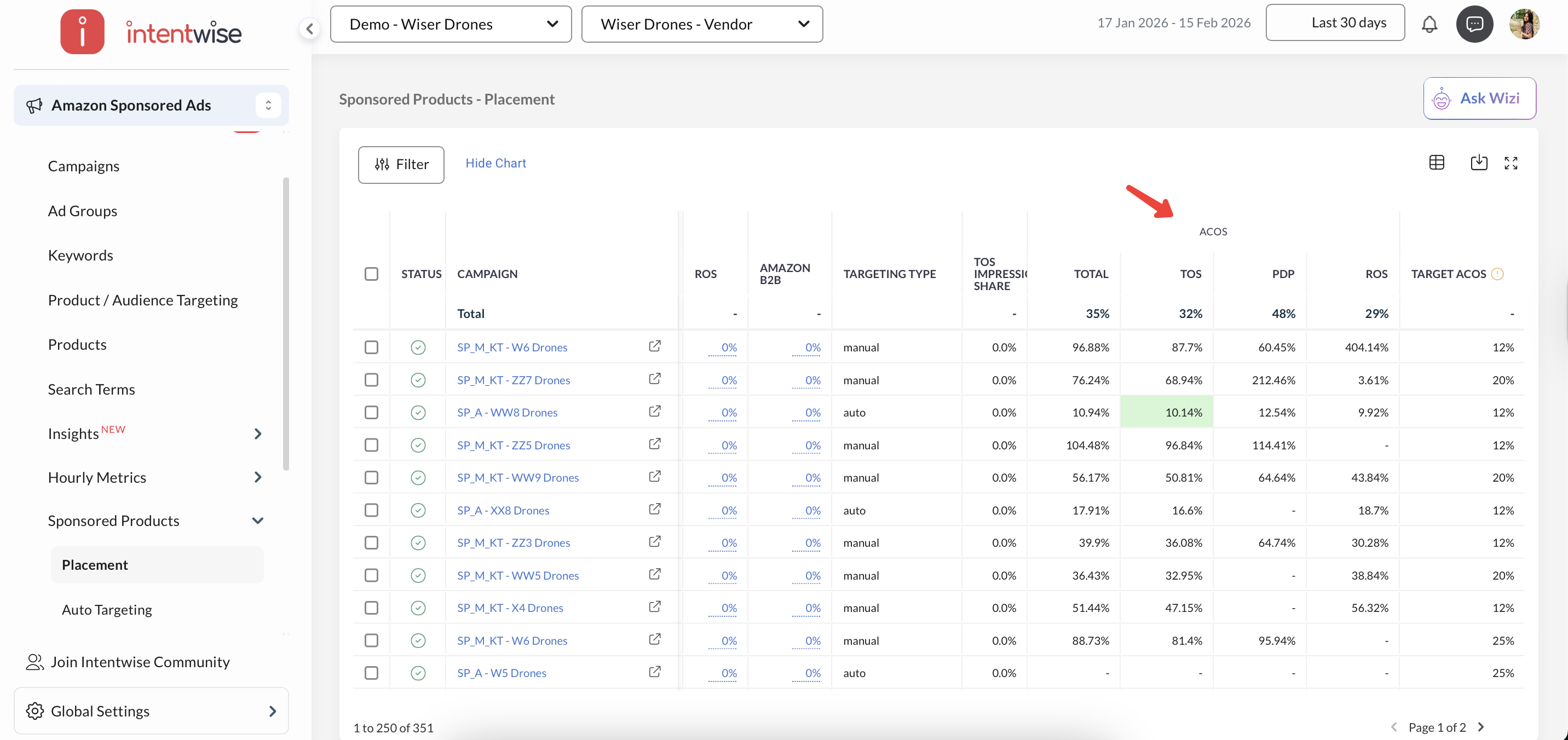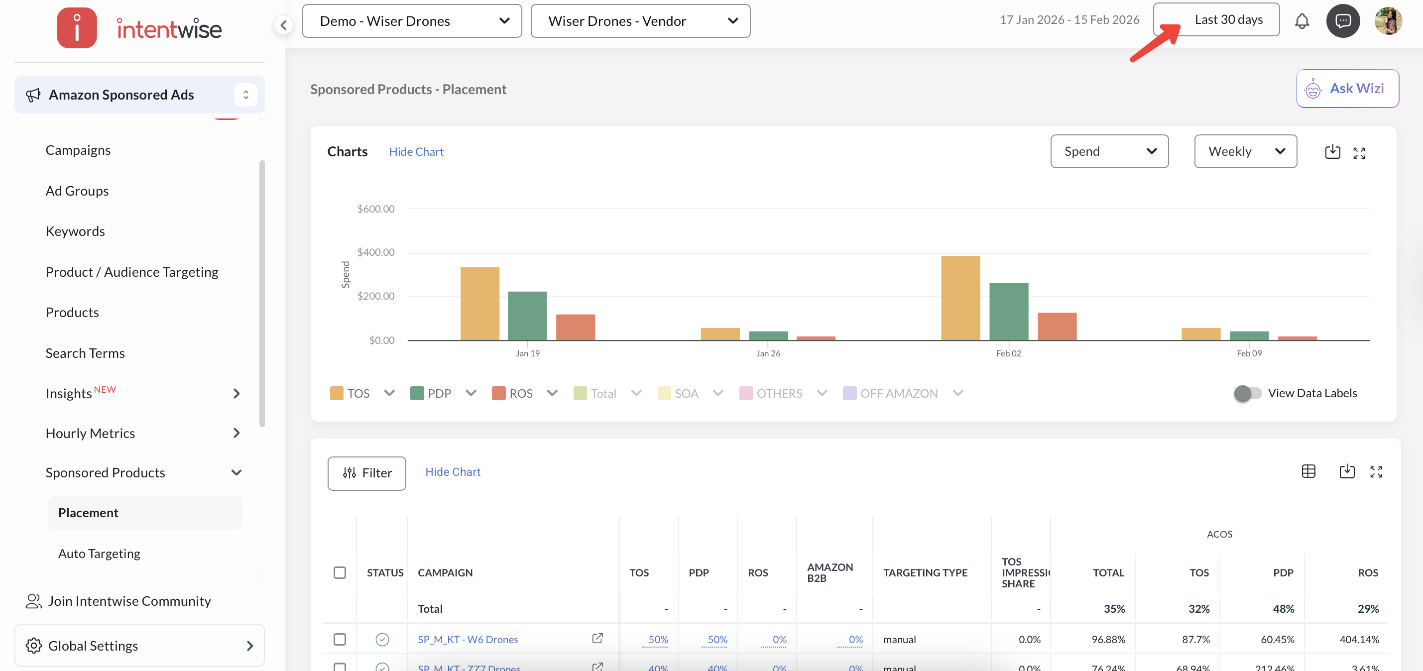 Note: On Intentwise, only ROS metrics are available for Sponsored Products. SOA (Search on Amazon) refers to similar placements—middle or bottom of search results and second page onward—but across other campaign types like Sponsored Brands. Since SOA metrics aren't currently available on the platform, we recommend focusing on ROS metrics for your analysis.