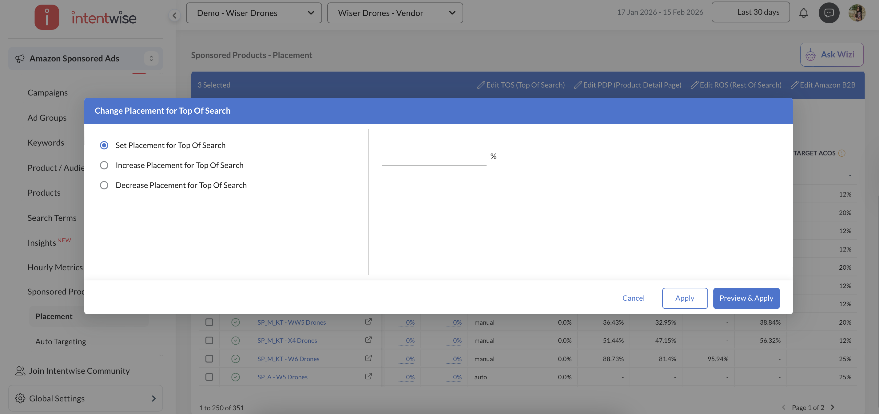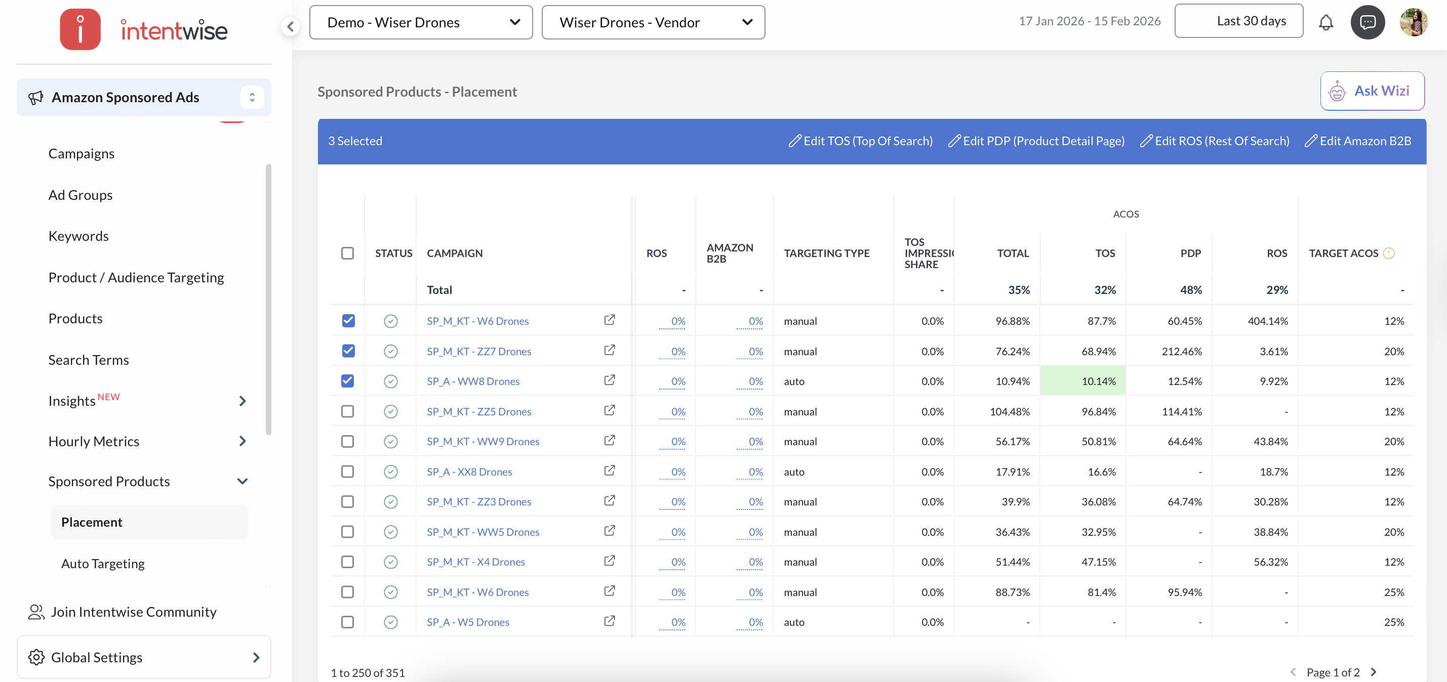 The Placement Dashboard on the Intentwise platform simplifies reviewing and adjusting placement bid settings. It streamlines tasks like downloading the daily placement report, aggregating metrics by campaign and placement, and making bid adjustments for Top of Search (TOS), Product Detail Page (PDP), Rest of Search (ROS), and Amazon (B2B).
