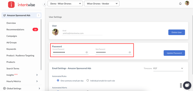 How can I change my password for the Intentwise account?