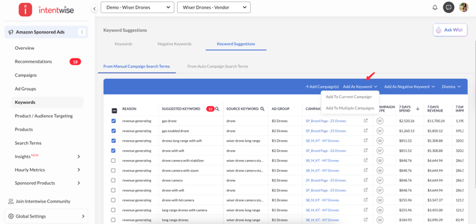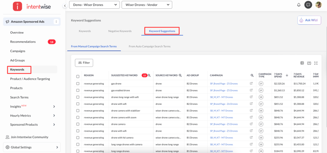 Click on the Keyword Suggestions Tab in the Keywords dashboard and go to the Manual Campaigns Suggestion Tab or Auto Campaign Suggestion Tab.