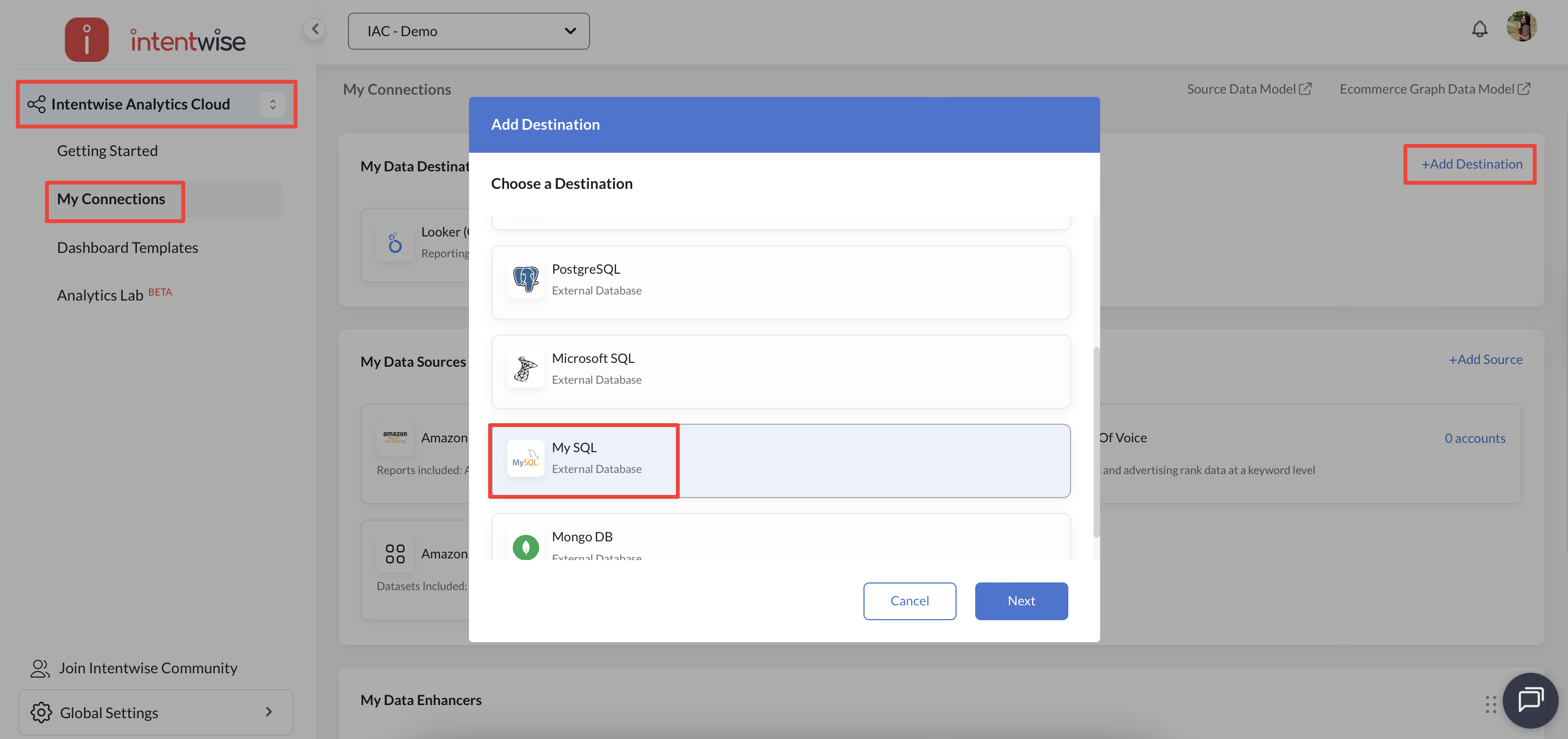 Now, go to the Intentwise platform and navigate to My Connections under Intentwise Analytics Cloud. Click on "+ Add Destination", choose MySQL as the destination and click Next.