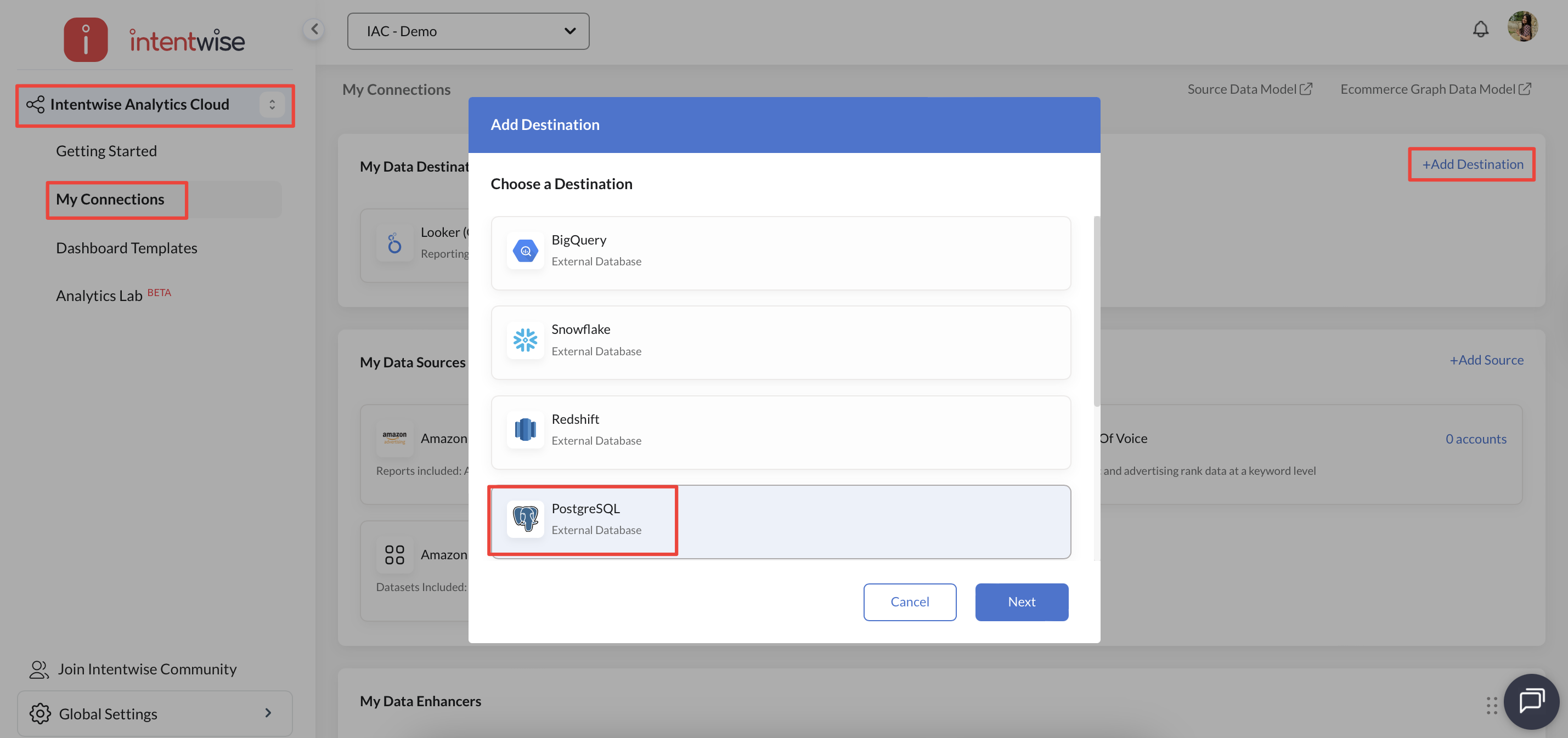 Now, go to the Intentwise platform and navigate to My Connections under Intentwise Analytics Cloud. Click on "+ Add Destination", choose PostgreSQL as the destination and click Next.