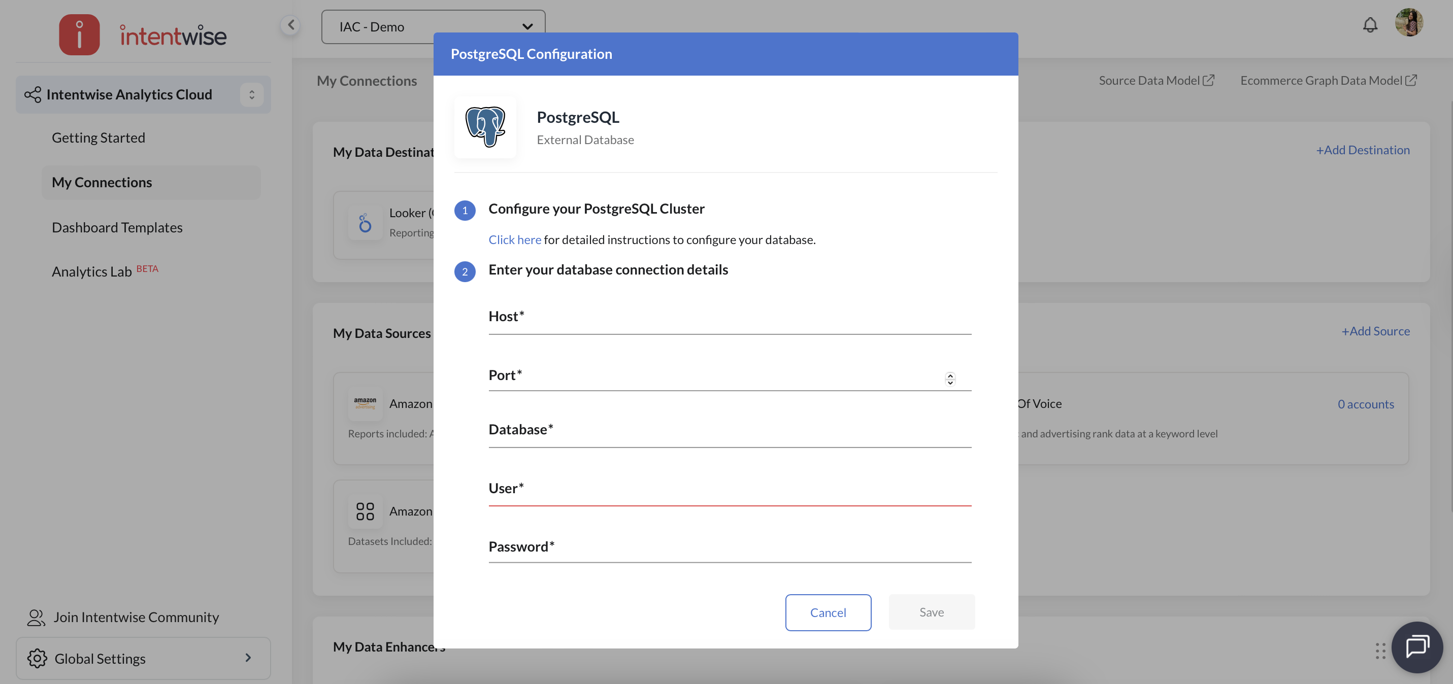 To configure PostgreSQL with Intentwise Analytics Cloud, follow these steps: